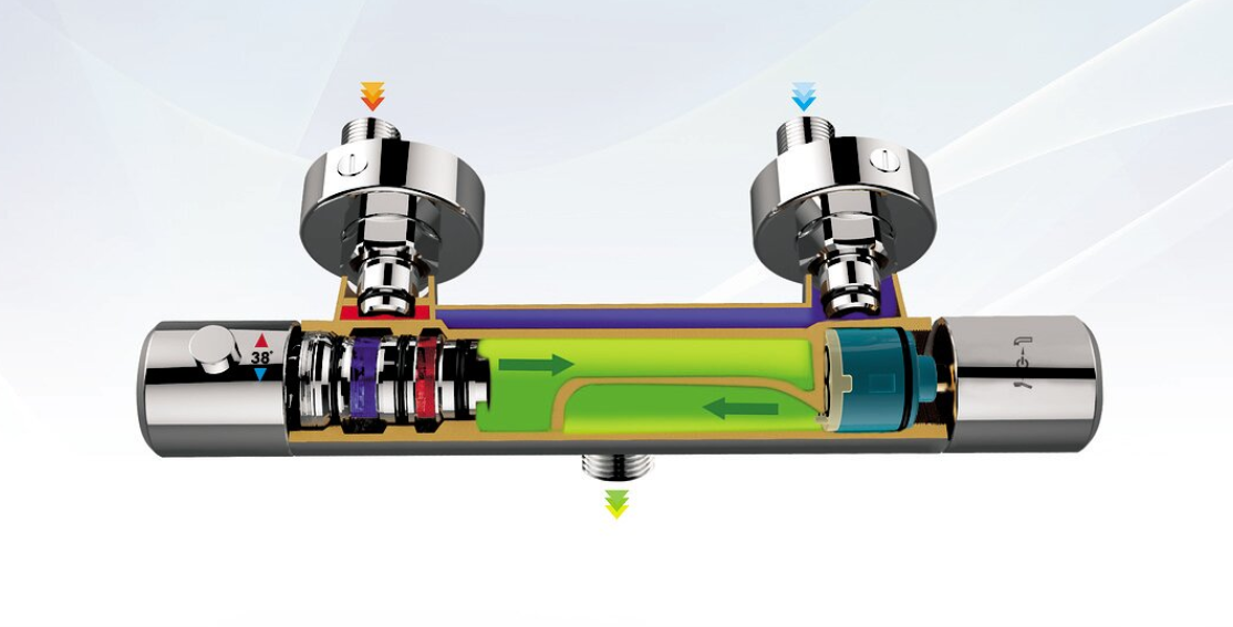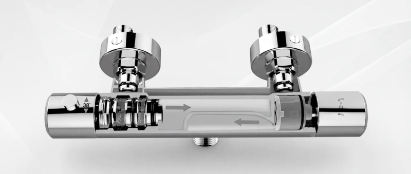 Принцип действия, на котором работает смеситель термостат, основан на перемещении подвижного патрона внутри устройства, реагирующего на колебания заданных параметров смешиваемого водяного потока. Патрон-ограничитель оснащен парафиновым стержнем и медным наконечником. Эти элементы содержатся в картридже, находящемся внутри металлической трубки, куда и поступает холодная и горячая вода. При увеличении или понижении температуры воды парафин расширяется либо сжимается, способствуя перемещению втулки-ограничителя в картридже. При этом сокращается пространство горячей или холодной струи, в зависимости от преобладания. Таким образом поддерживаются заданные параметры.
