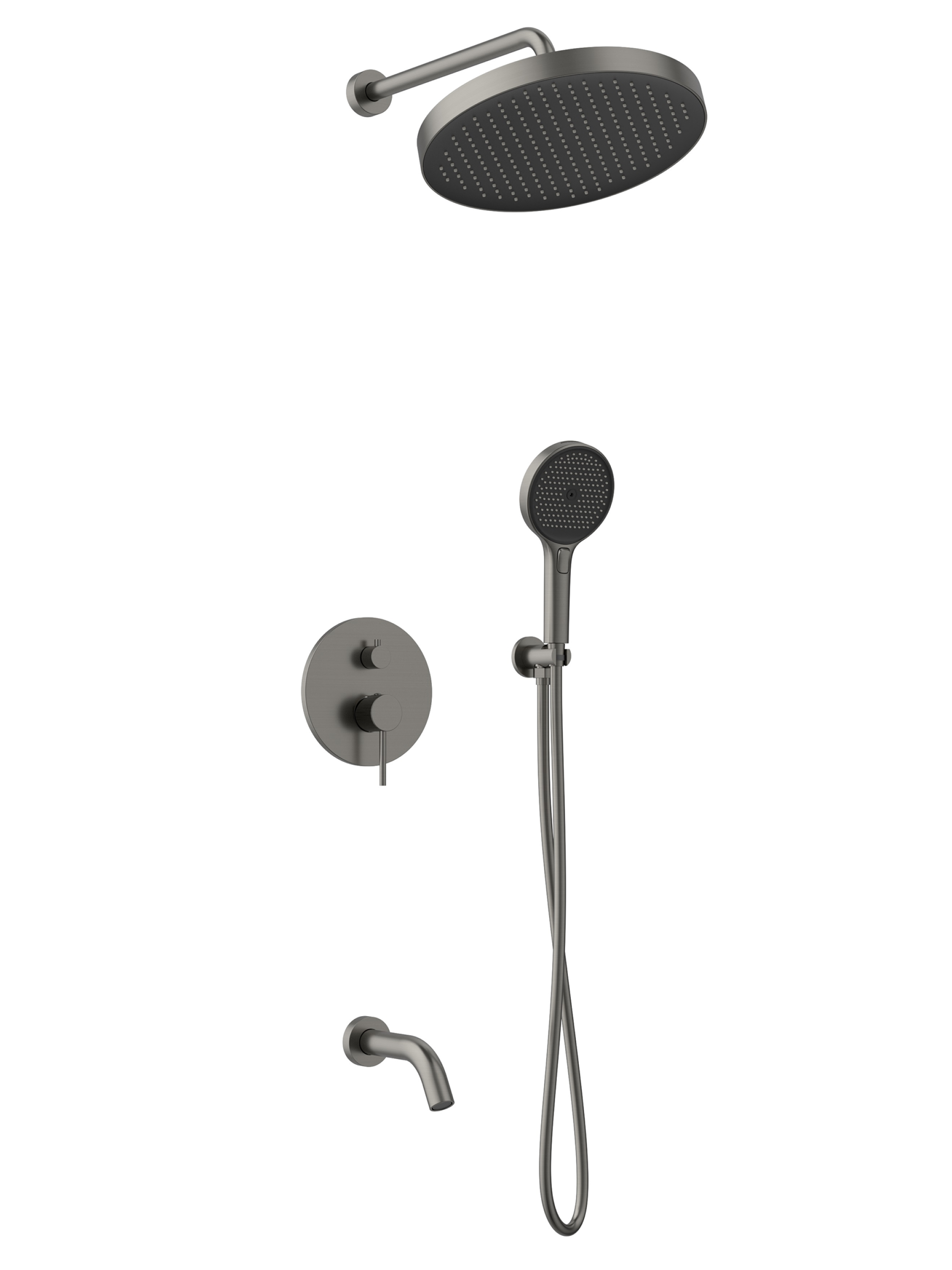 встраиваемая часть, смеситель с трехпозиционным переключением, излив, штуцер/держатель ручного душа, ручной душ, гибкий полимерный шланг, верхний душ, кронштейн держатель для верхнего душа, отражатели, установочный комплект.
