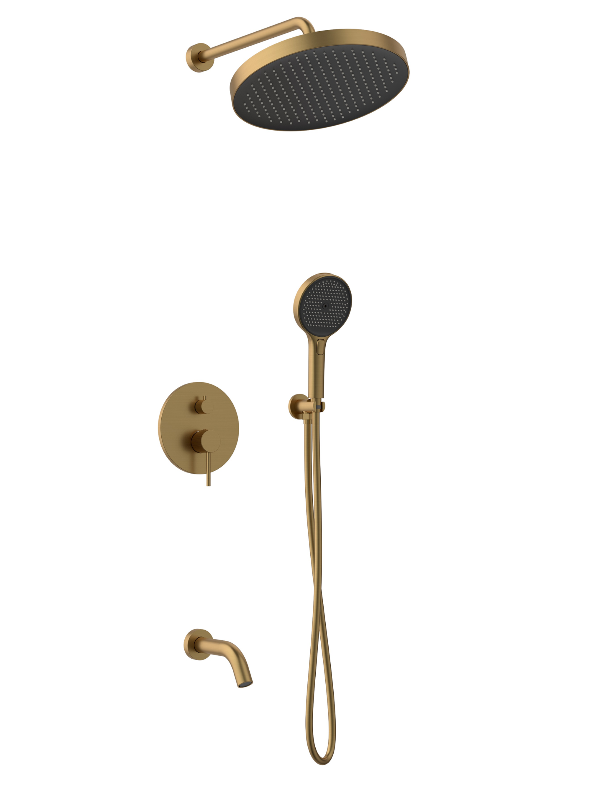 встраиваемая часть, смеситель с трехпозиционным переключением, излив, штуцер/держатель ручного душа, ручной душ, гибкий полимерный шланг, верхний душ, кронштейн держатель для верхнего душа, отражатели, установочный комплект.