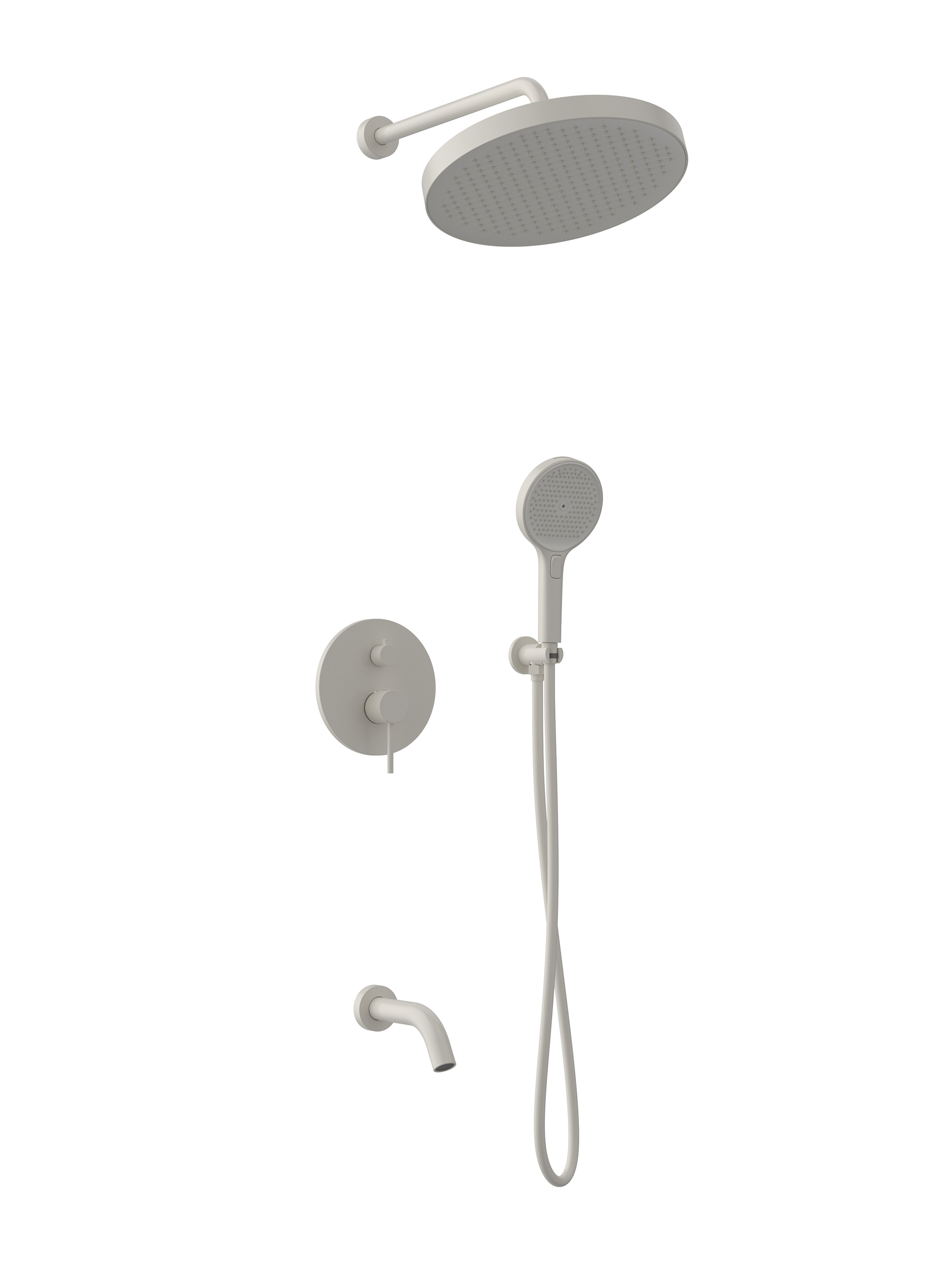 встраиваемая часть, смеситель с трехпозиционным переключением, излив, штуцер/держатель ручного душа, ручной душ, гибкий полимерный шланг, верхний душ, кронштейн держатель для верхнего душа, отражатели, установочный комплект.