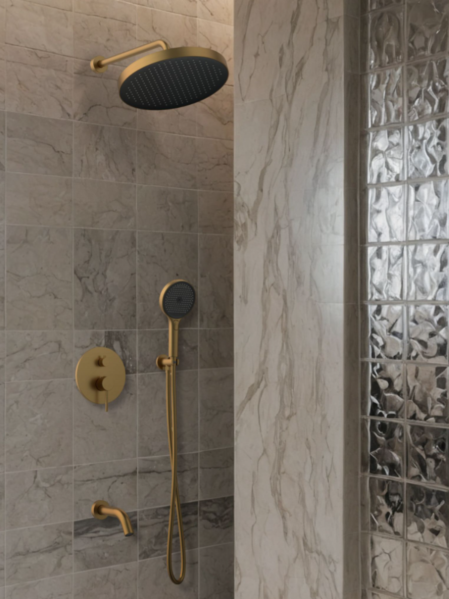 встраиваемая часть, смеситель с трехпозиционным переключением, излив, штуцер/держатель ручного душа, ручной душ, гибкий полимерный шланг, верхний душ, кронштейн держатель для верхнего душа, отражатели, установочный комплект.