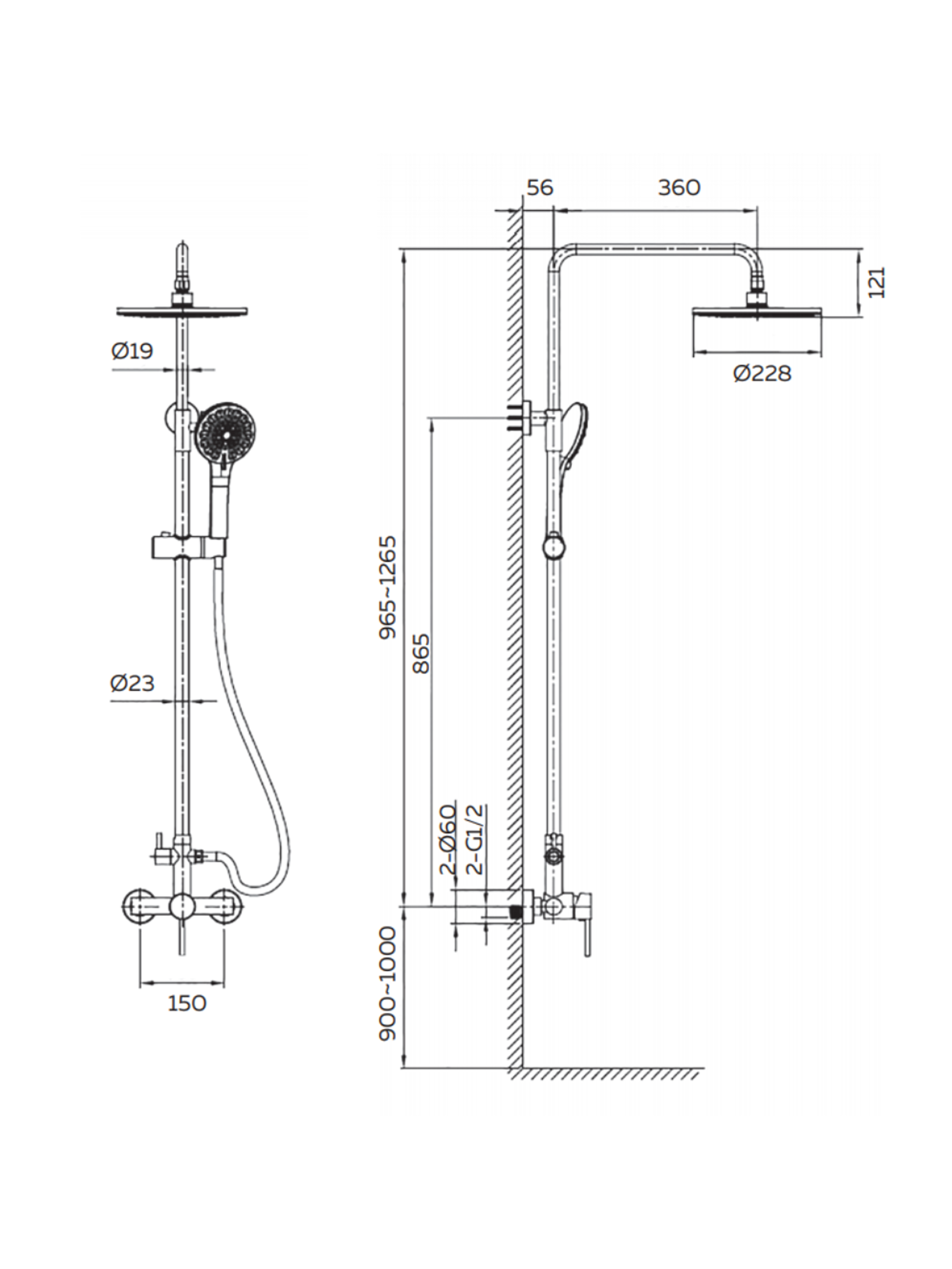 Комплектация: смеситель, телескопическая штанга с держателем для ручного душа, ручной душ, гибкий полимерный шланг, верхний душ, эксцентрики, чаши декоративные