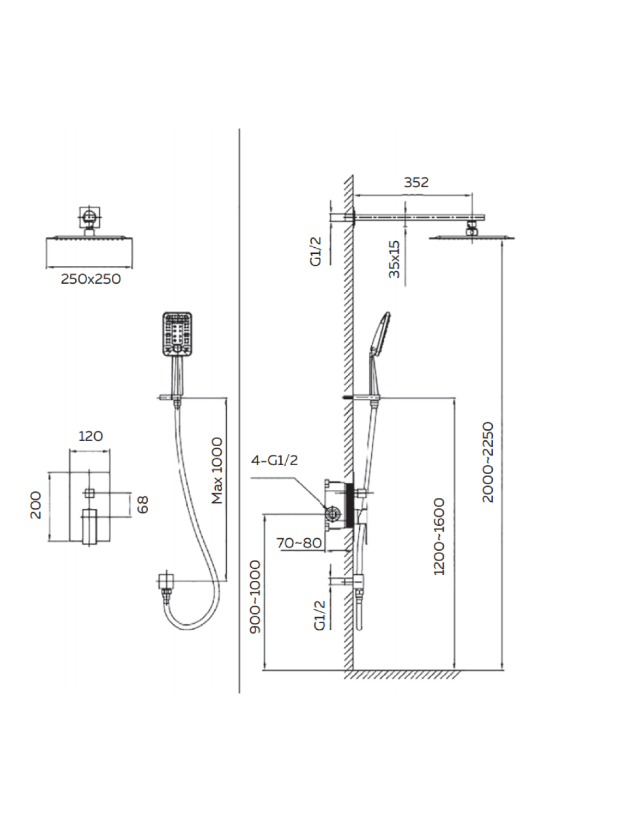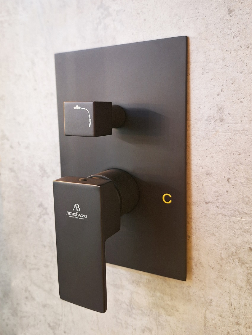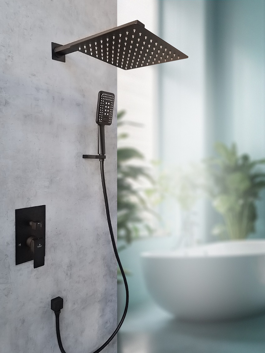 Комплектация: встраиваемая часть, смеситель с двухпозиционным переключением, штуцер, держатель ручного душа, двухрежимный ручной душ, гибкий полимерный шланг, верхний душ, кронштейн держатель для верхнего душа