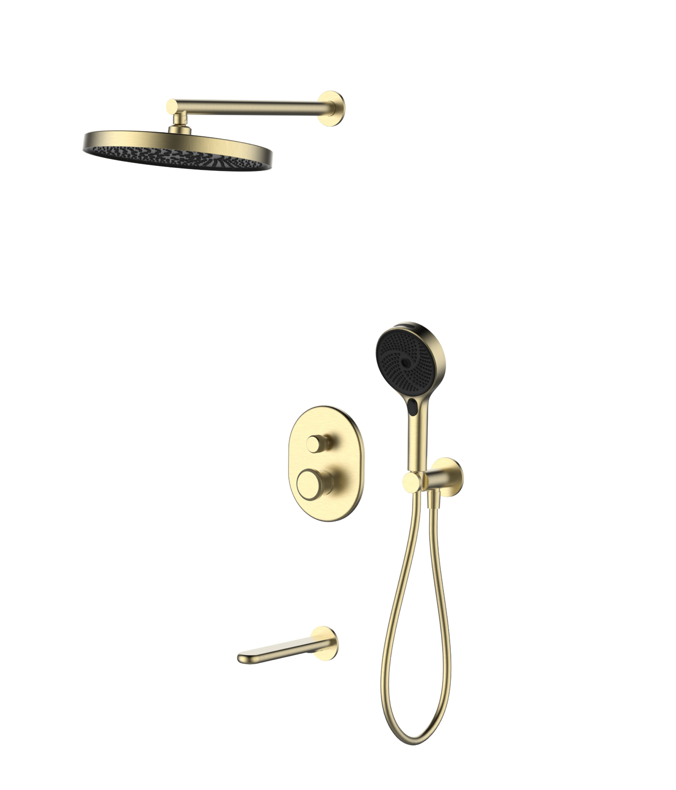 встраиваемая часть, смеситель с трехпозиционным переключением, излив, штуцер/держатель ручного душа, ручной душ, гибкий полимерный шланг, верхний душ, кронштейн держатель для верхнего душа, отражатели, установочный комплект.