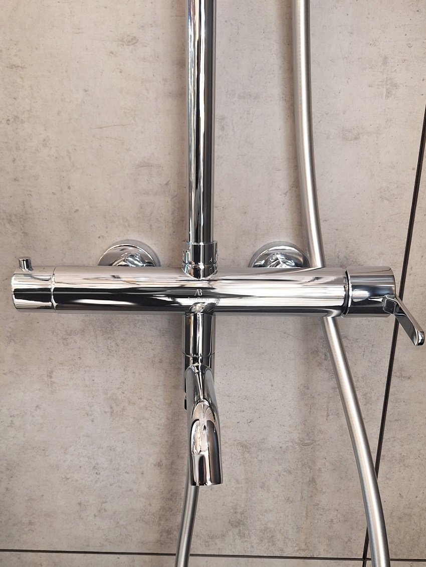 Комплектация: смеситель настенного монтажа, телескопическая штанга с держателем для ручного душа, ручной душ, гибкий полимерный шланг, верхний душ, аэратор, эксцентрики, чаши декоративные