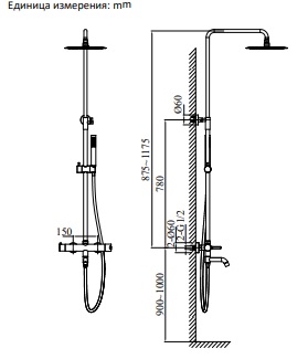 Комплектация: смеситель настенного монтажа, телескопическая штанга с держателем для ручного душа, ручной душ, гибкий полимерный шланг, верхний душ, аэратор, эксцентрики, чаши декоративные