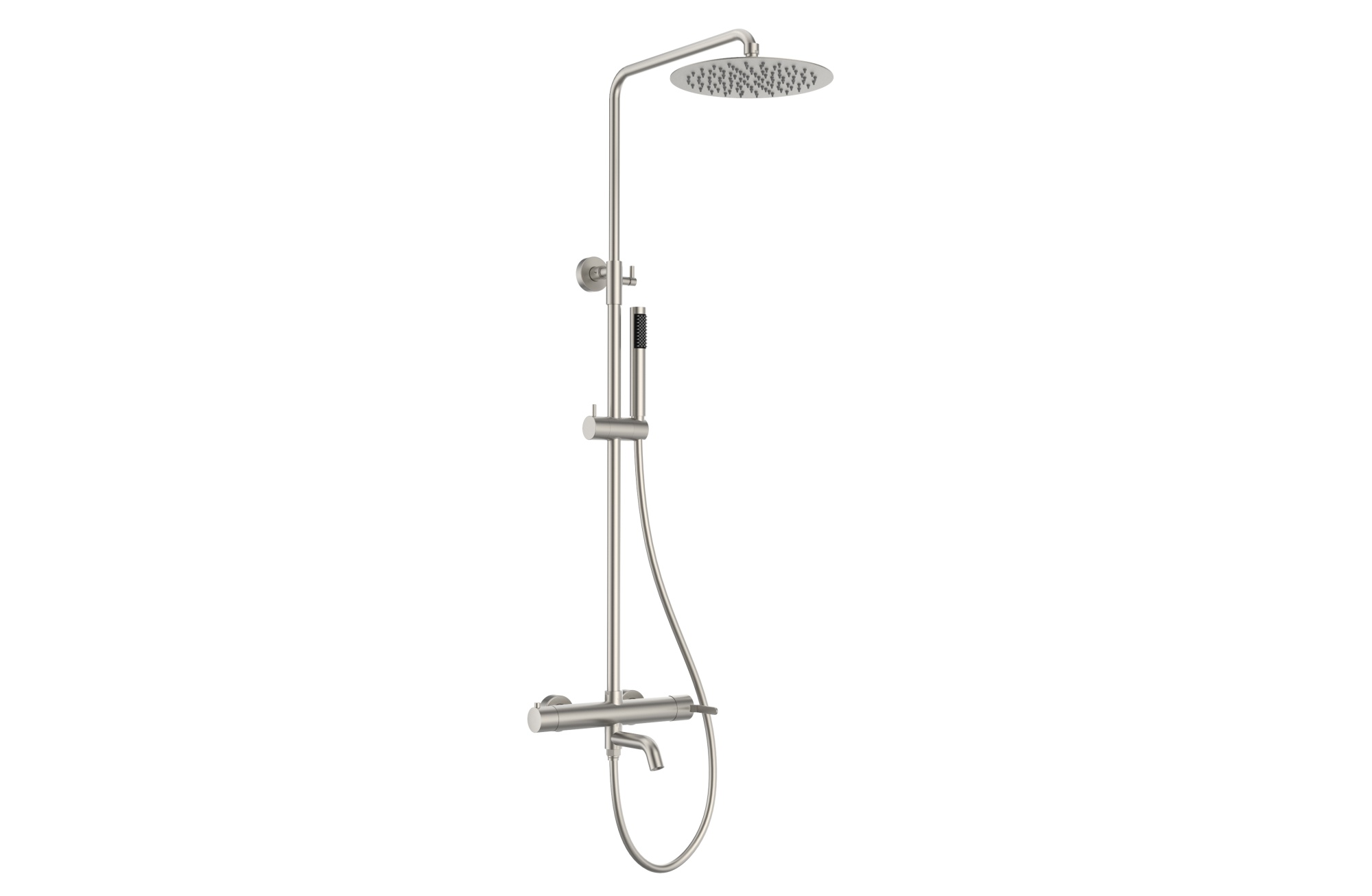 Комплектация: смеситель настенного монтажа, телескопическая штанга с держателем для ручного душа, ручной душ, гибкий полимерный шланг, верхний душ, аэратор, эксцентрики, чаши декоративные