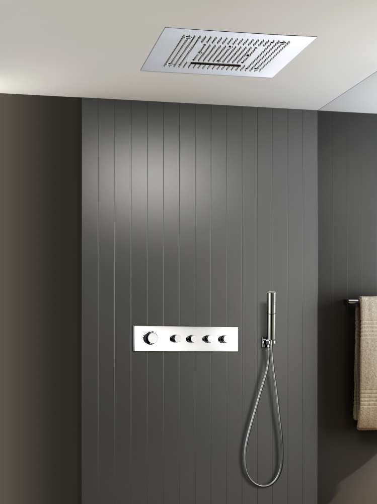 Комплектация: встраиваемая часть, термостатический смеситель , штуцер/держатель ручного душа, латунный двухрежимный ручной душ, гибкий полимерный шланг,  латунный мультифункциональный  верхний душ, установочный комплект