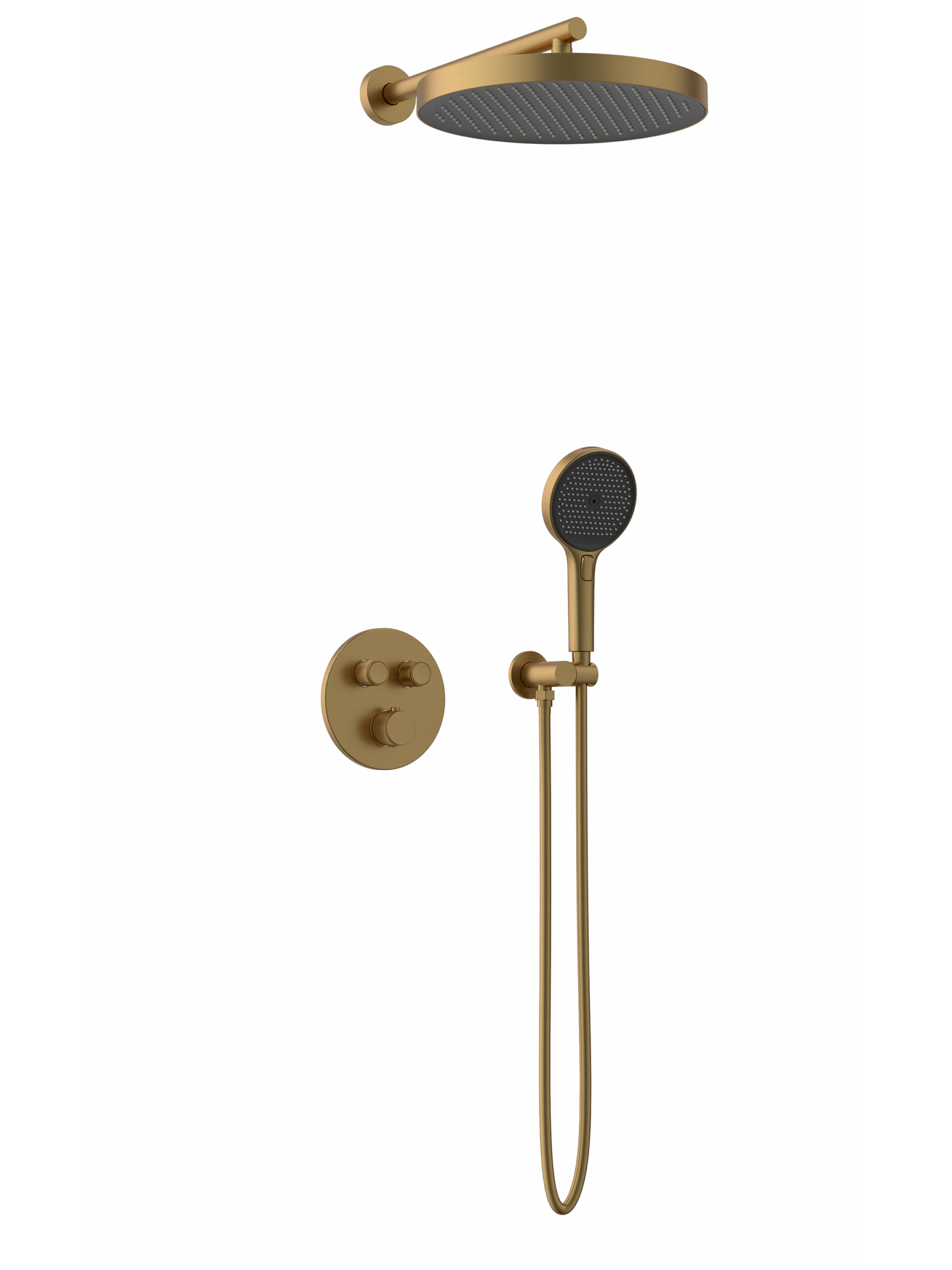 PVD - покрытие, система ToccoFreddo - исключает возможность ожога о внешнюю поверхность смесителя, система Gioco верхнего душа +/-15º , пластиковый верхний душ 32 см, гибкий полимерный шланг с защитой от заломов, двухрежимный пластиковый ручной душ с переключателями с внутренней и внешней стороны, встраиваемая часть в установочном боксе оснащена уровнем, кнопочное переключение на режим верхней и ручной лейки