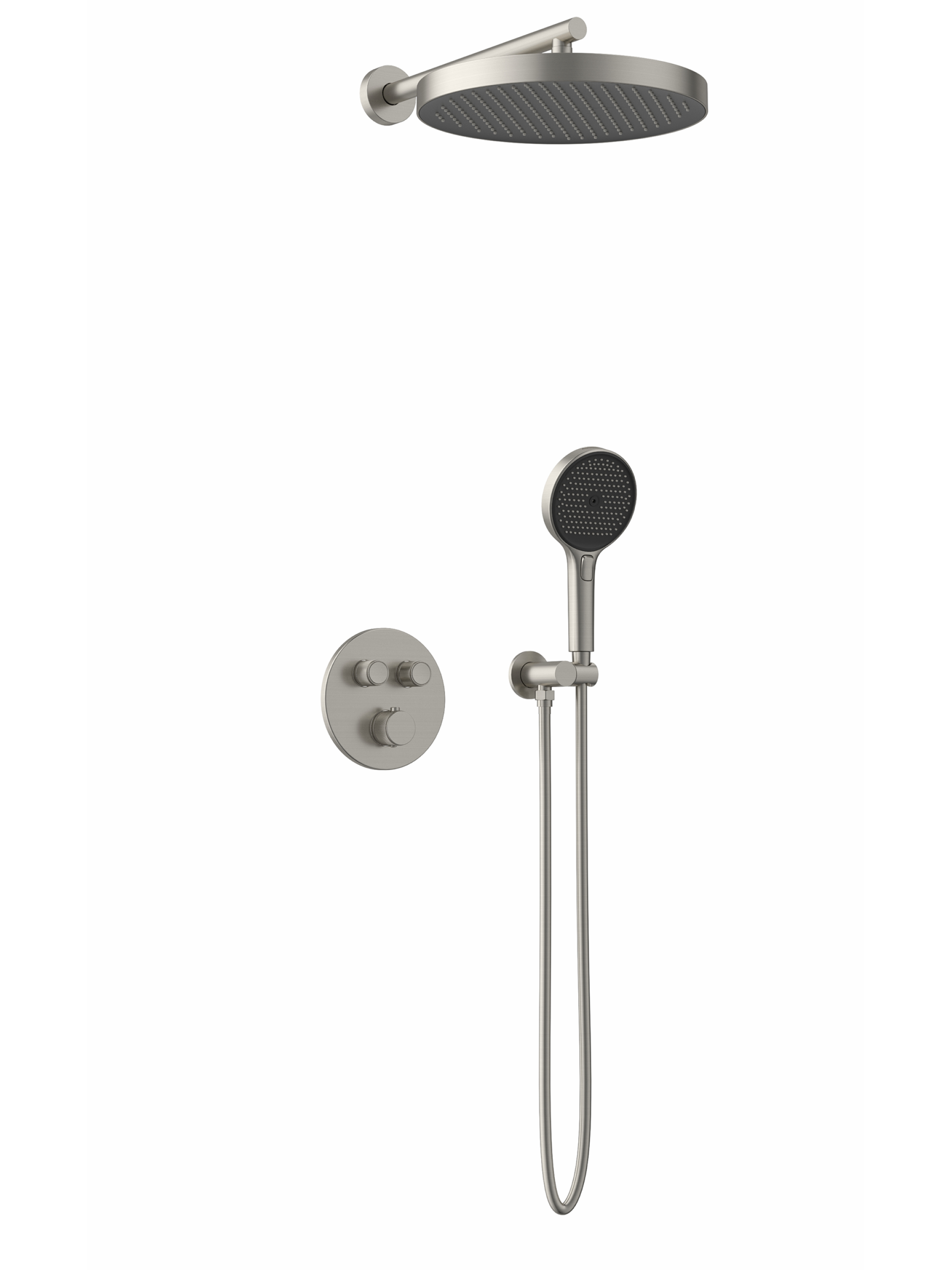 Комплектация: встраиваемая часть, термостатический смеситель, штуцер/держатель ручного душа, ручной душ, гибкий полимерный шланг, верхний душ, кронштейн излив для верхнего душа, отражатели, установочный комплект