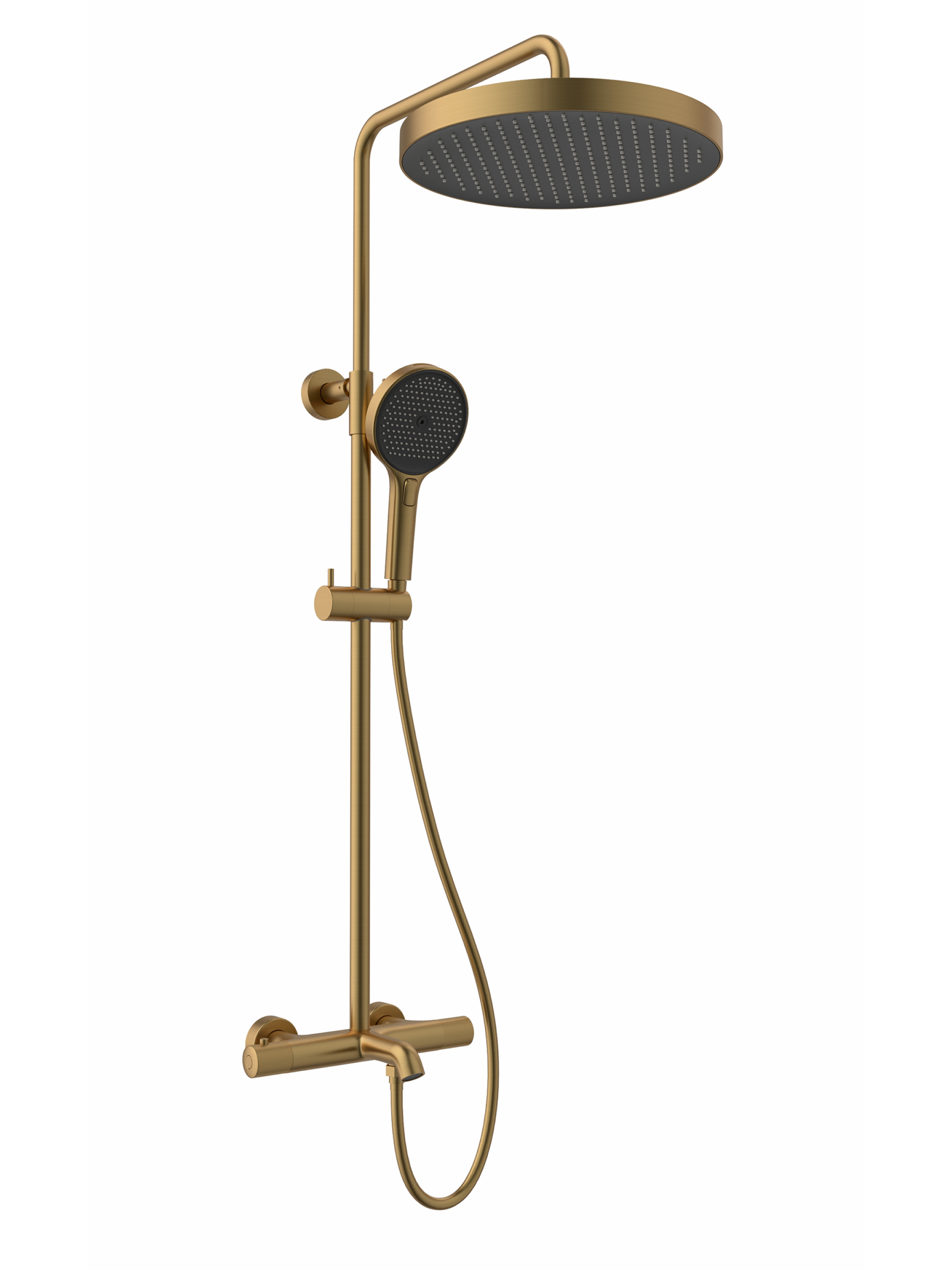 Комплектация: термостатический смеситель, телескопическая штанга с держателем для ручного душа, ручной душ, гибкий полимерный шланг, верхний душ, аэратор, эксцентрики, чаши декоративные, установочный комплект