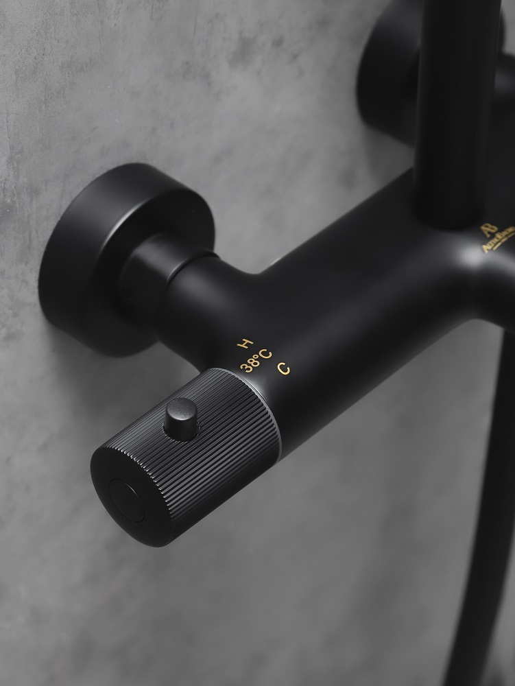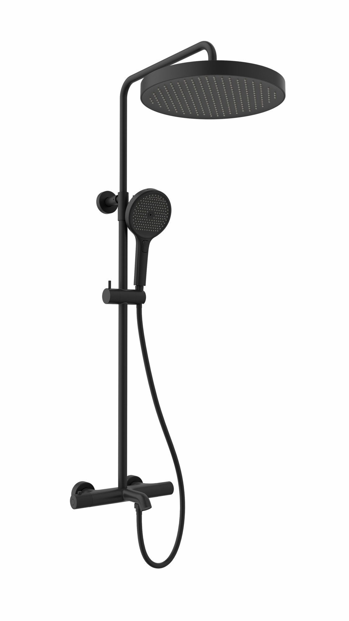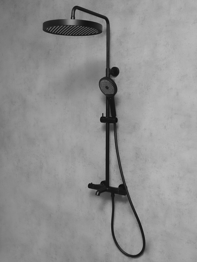 Комплектация: термостатический смеситель, телескопическая штанга с держателем для ручного душа, ручной душ, гибкий полимерный шланг, верхний душ, аэратор, эксцентрики, чаши декоративные, установочный комплект