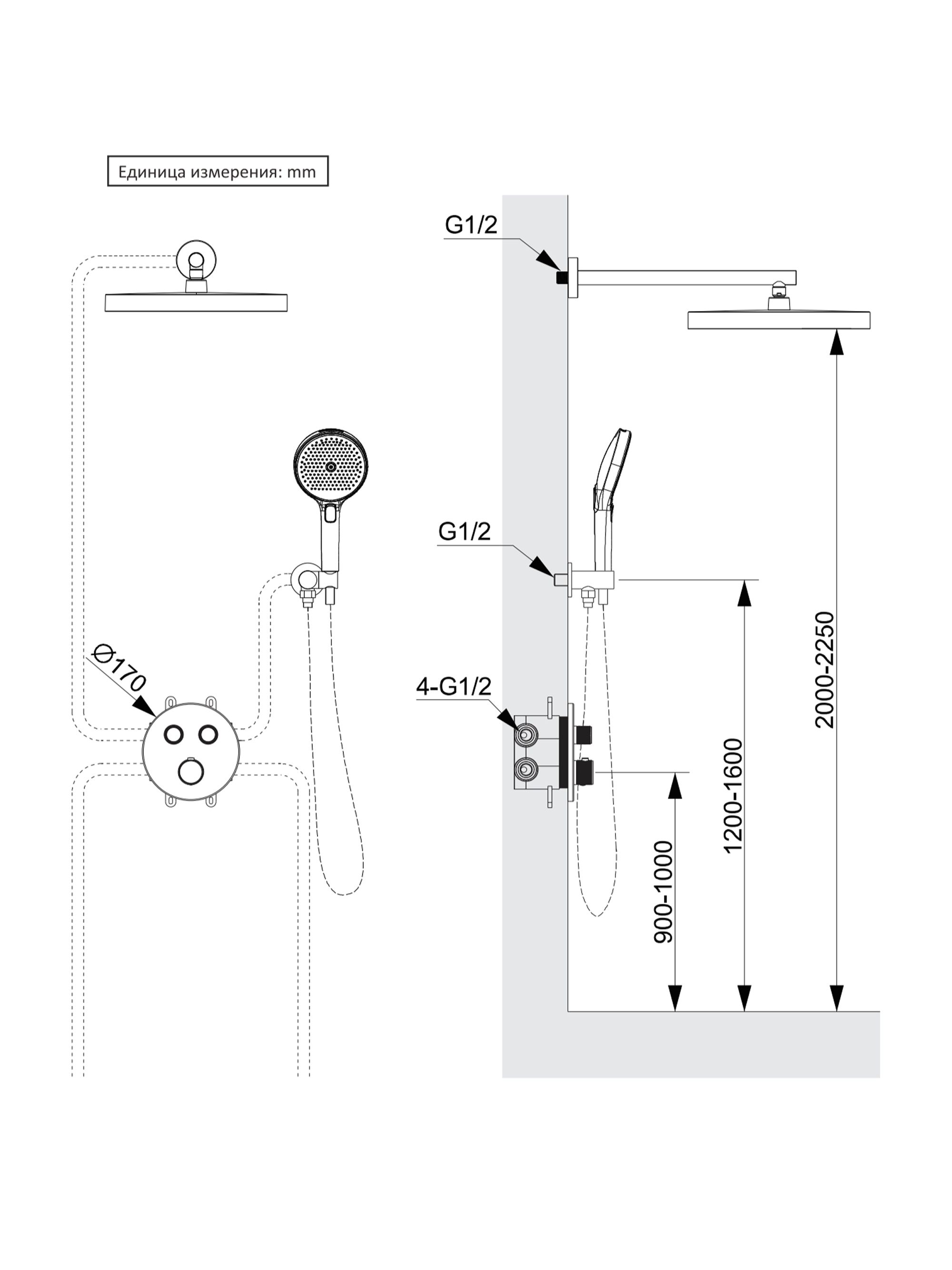 Комплектация: встраиваемая часть, термостатический смеситель, штуцер/держатель ручного душа, ручной душ, гибкий полимерный шланг, верхний душ, кронштейн излив для верхнего душа, отражатели, установочный комплект
