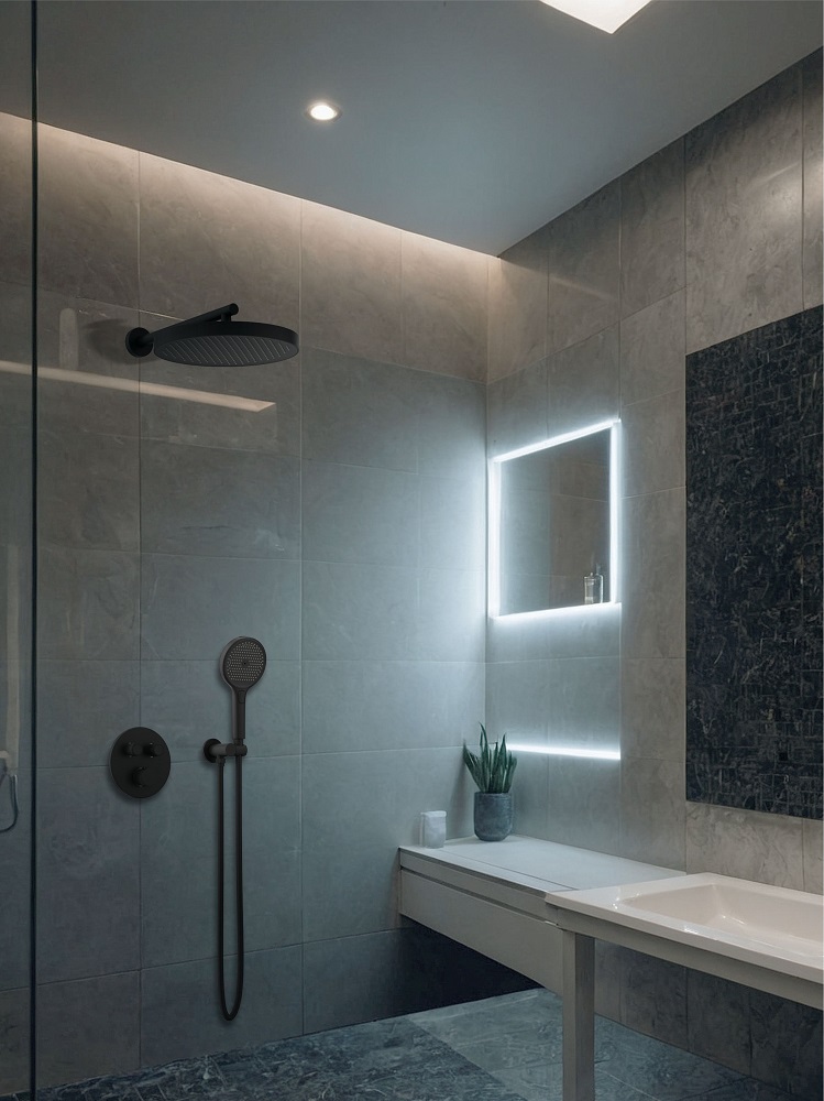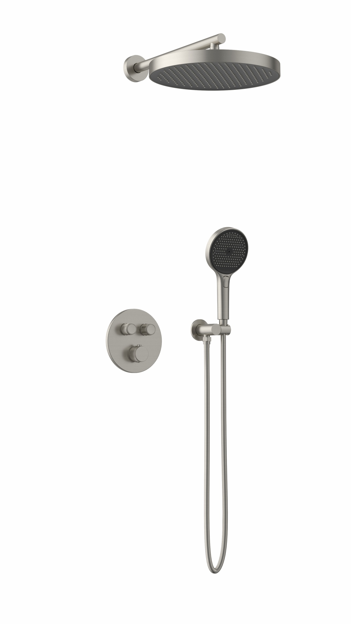 Комплектация: встраиваемая часть, термостатический смеситель, штуцер/держатель ручного душа, ручной душ, гибкий полимерный шланг, верхний душ, кронштейн излив для верхнего душа, отражатели, установочный комплект
