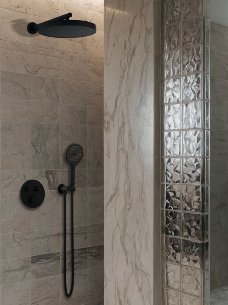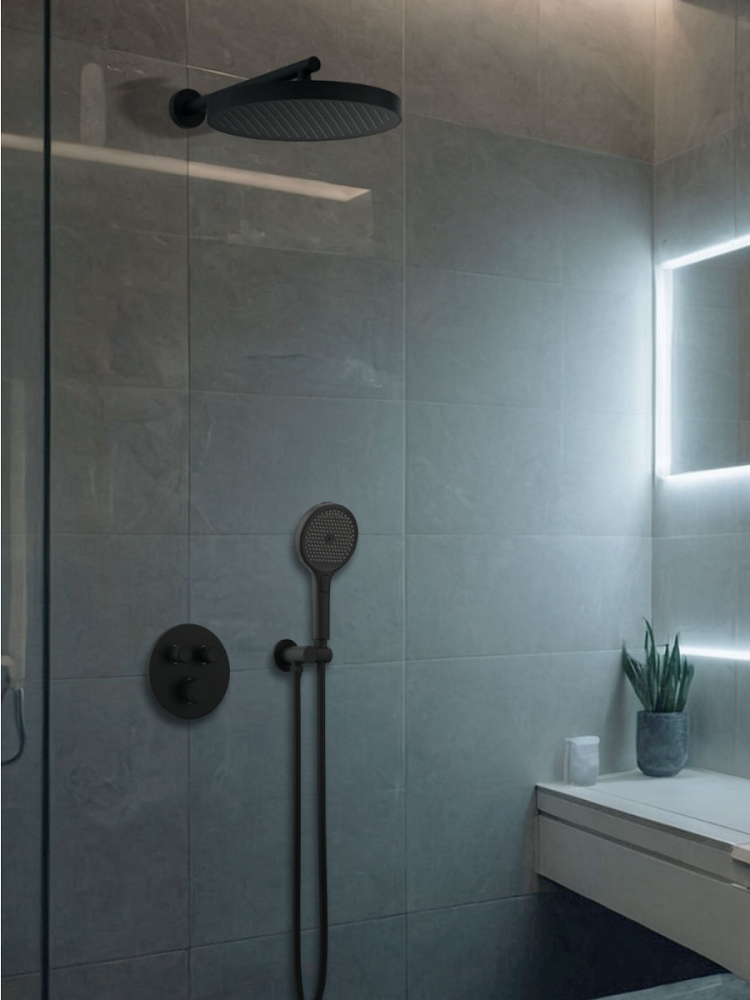 Комплектация: встраиваемая часть, термостатический смеситель, штуцер/держатель ручного душа, ручной душ, гибкий полимерный шланг, верхний душ, кронштейн излив для верхнего душа, отражатели, установочный комплект