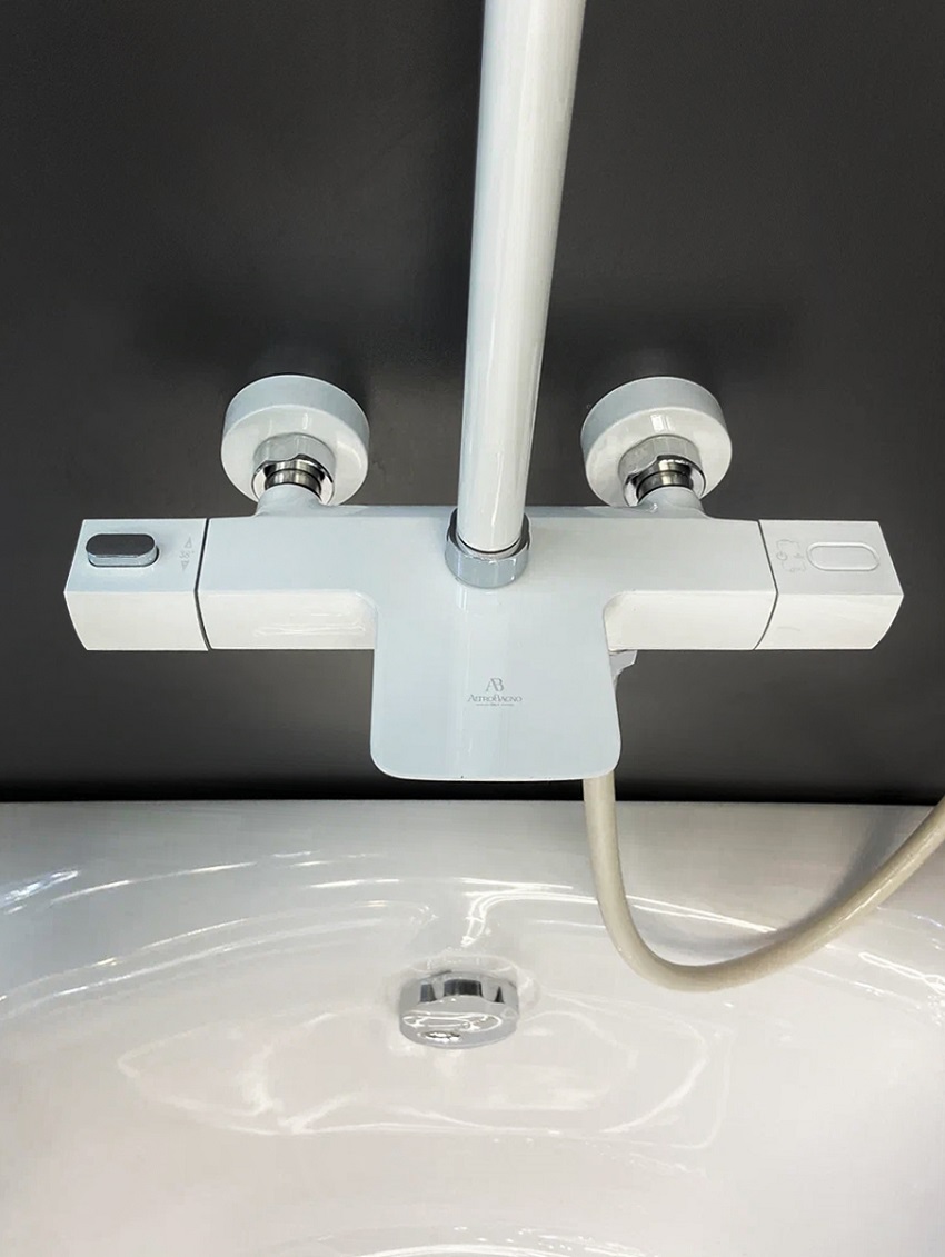 Комплектация: термостатический смеситель, телескопическая штанга с держателем для ручного душа, ручной душ, гибкий полимерный шланг, верхний душ, аэратор, эксцентрики, декоративные чаши
