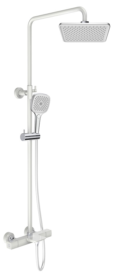 термостатический смеситель, телескопическая штанга с держателем для ручного душа, ручной душ, гибкий полимерный шланг, верхний душ, аэратор, эксцентрики, декоративные чаши