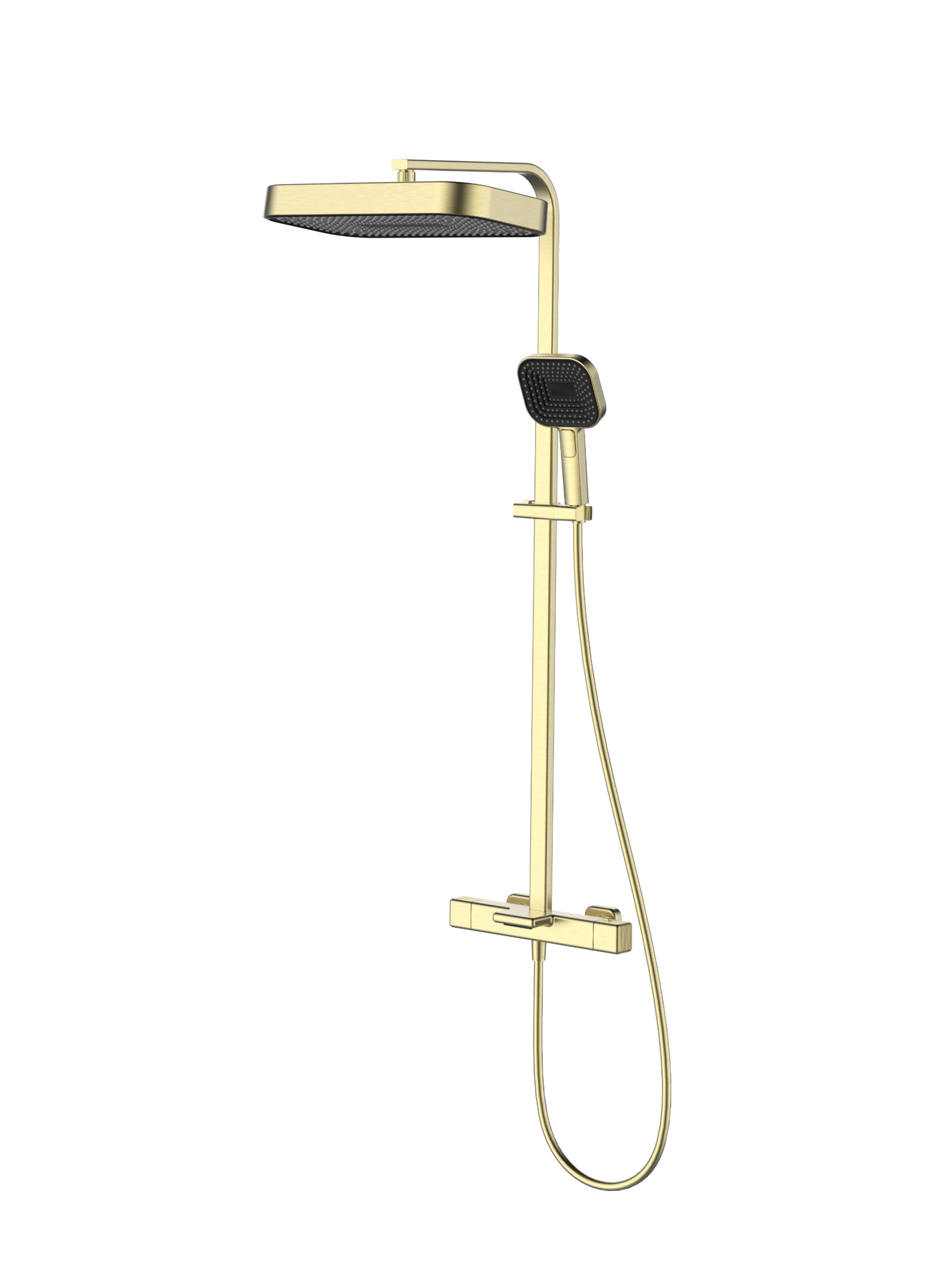 термостатический смеситель, телескопическая штанга с держателем для ручного душа, ручной душ, гибкий полимерный шланг, верхний душ, аэратор, эксцентрики, чаши декоративные, установочный комплект