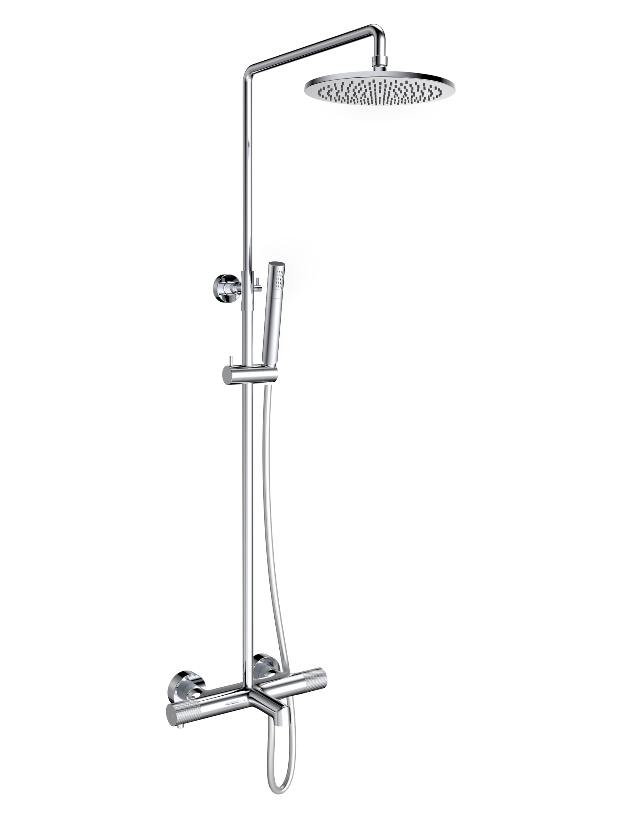 Комплектация: термостатический смеситель, телескопическая штанга с держателем для ручного душа, латунный ручной душ, гибкий полимерный шланг, латунный верхний душ, аэратор, эксцентрики, чаши декоративные