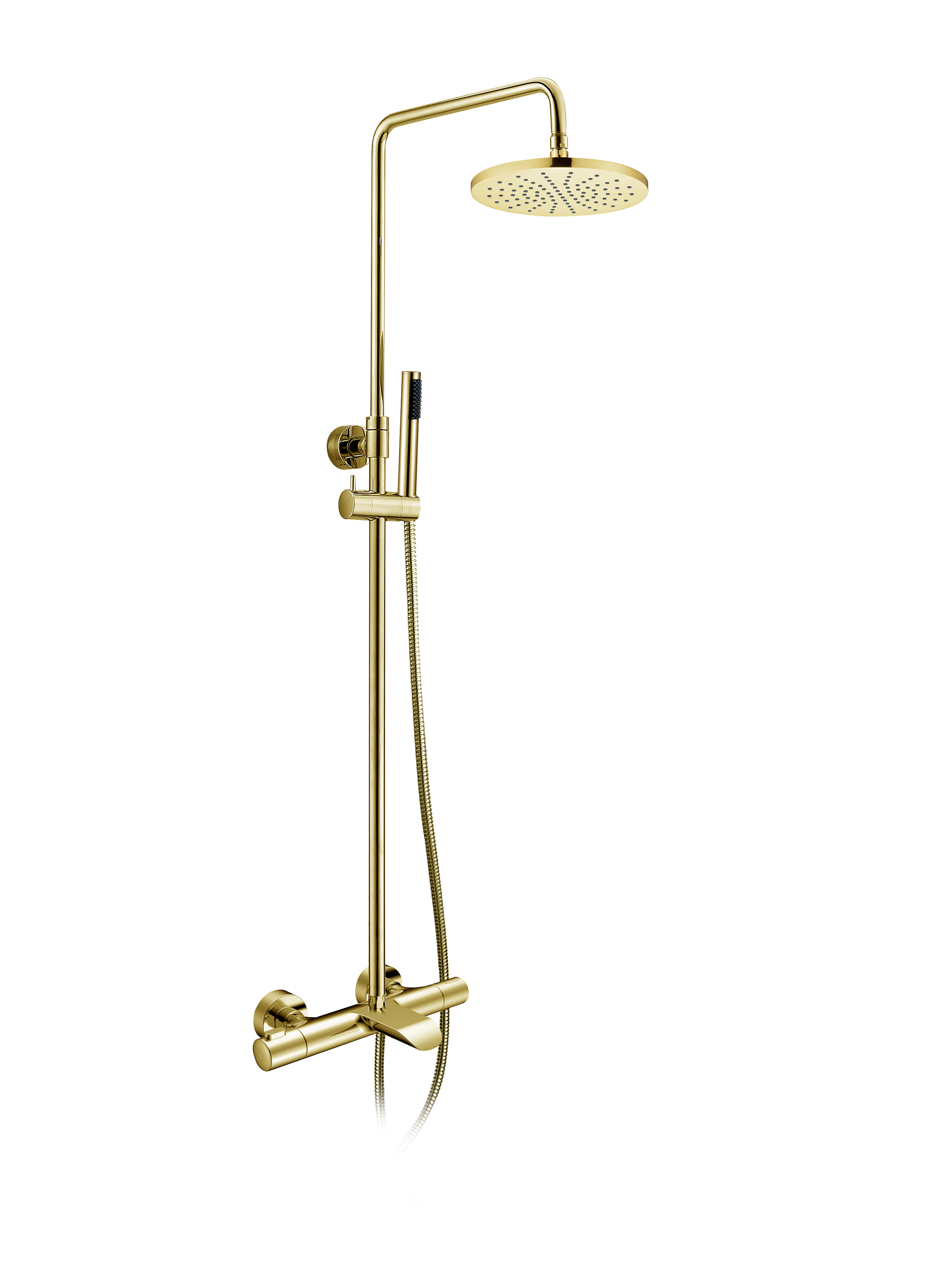 термостатический смеситель, телескопическая штанга с держателем для ручного душа, ручной душ, гибкий полимерный шланг, латунный верхний душ, аэратор, эксцентрики, чаши декоративные