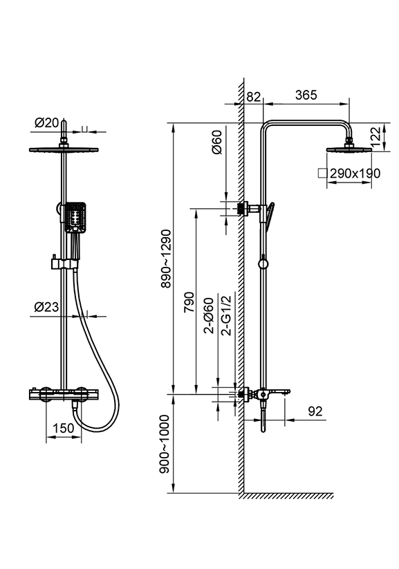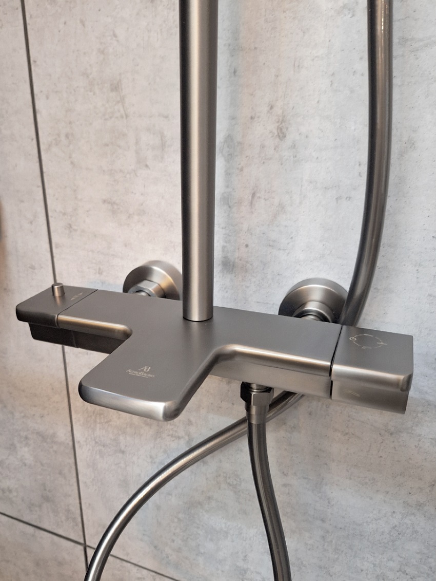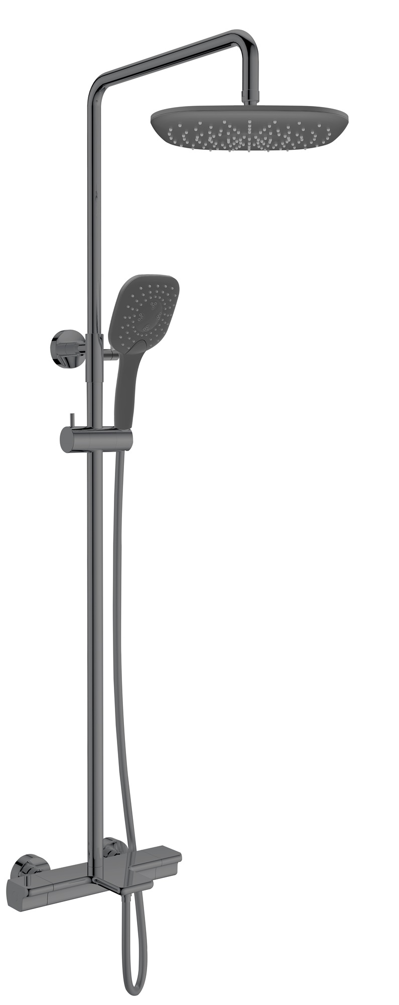 Комплектация: термостатический смеситель, телескопическая штанга с держателем для ручного душа, ручной душ, гибкий полимерный шланг, верхний душ, аэратор, эксцентрики, декоративные чаши