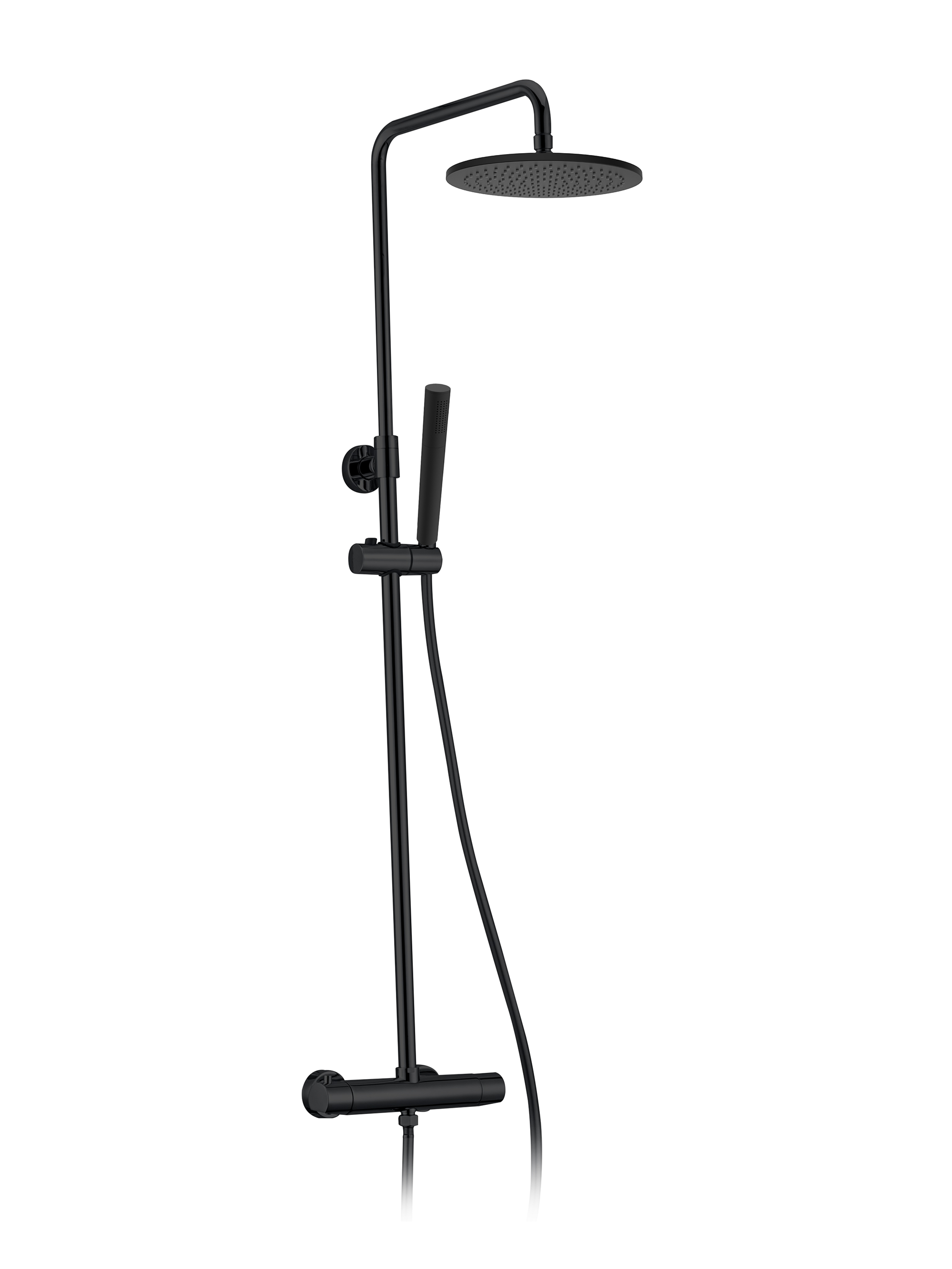 Комплектация: термостатический смеситель, телескопическая штанга с держателем для ручного душа, латунный ручной душ, гибкий полимерный шланг, латунный верхний душ, аэратор, эксцентрики, чаши декоративные