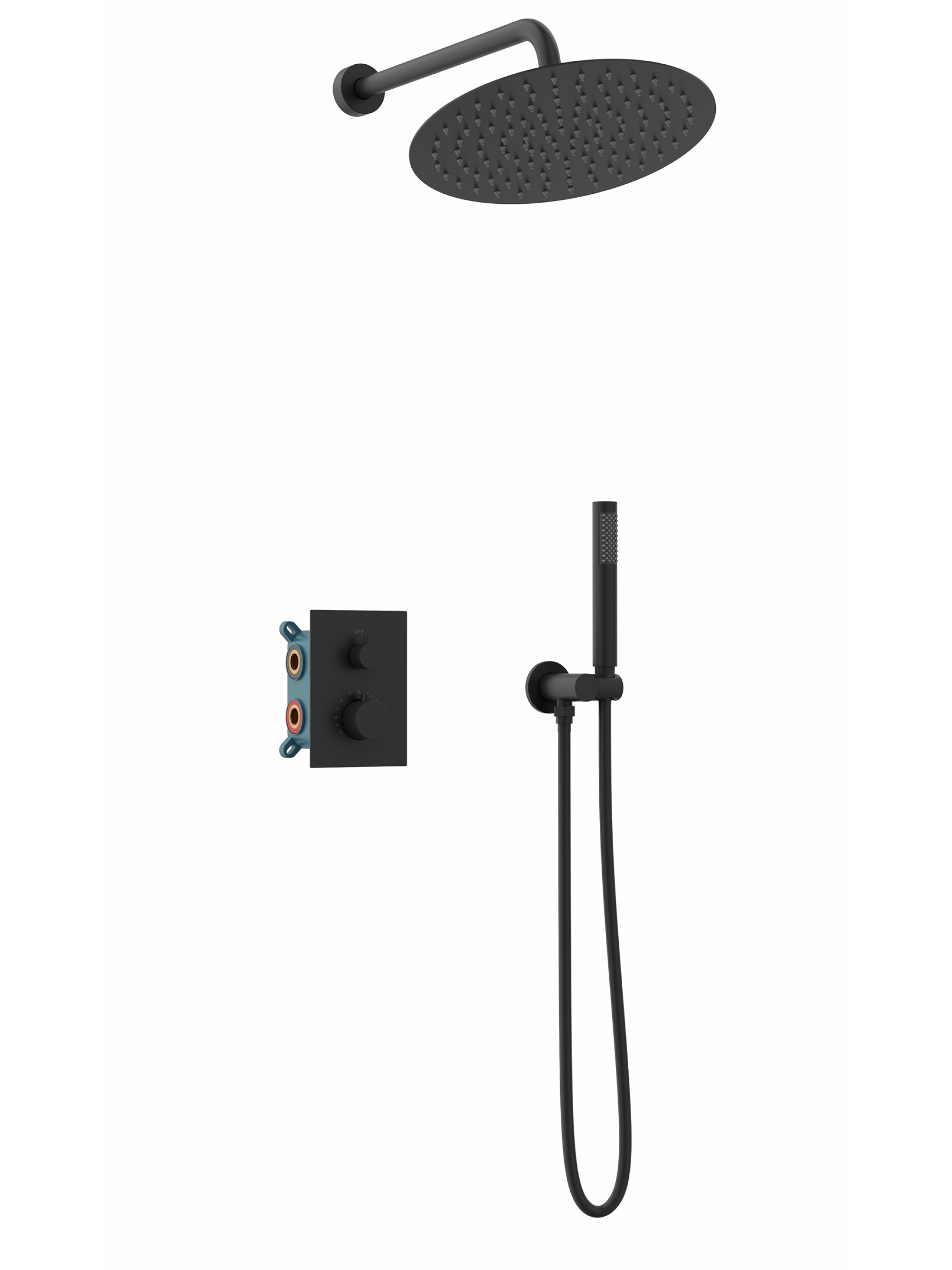 Комплектация: встраиваемая часть, термостатический смеситель, штуцер/держатель ручного душа, латунный ручной душ, гибкий полимерный шланг, латунный верхний душ, кронштейн держатель для верхнего душа
