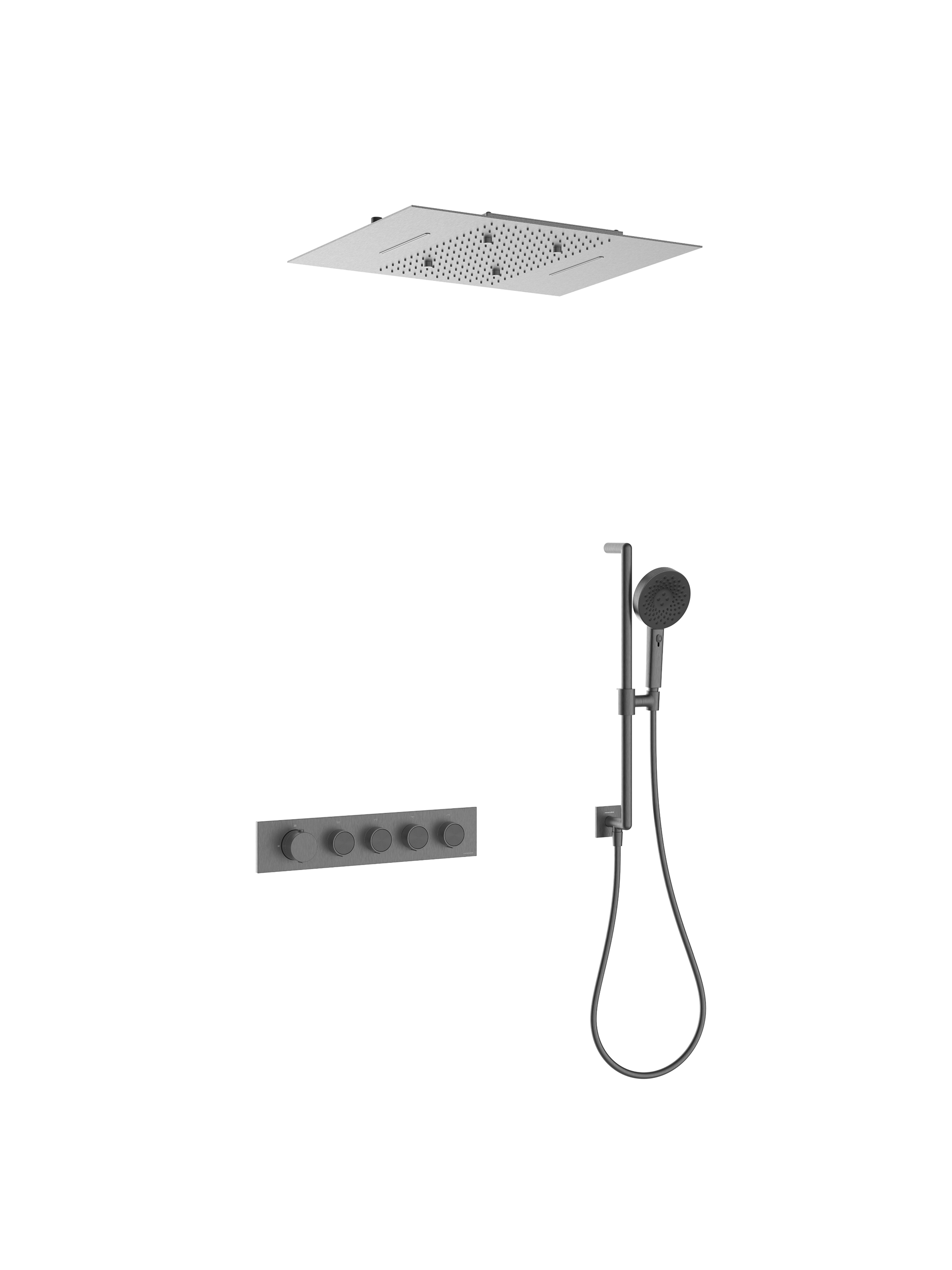 встраиваемая часть, термостатический смеситель , штуцер/держатель ручного душа, латунный двухрежимный ручной душ, гибкий полимерный шланг, латунный мультифункциональный верхний душ, установочный комплект