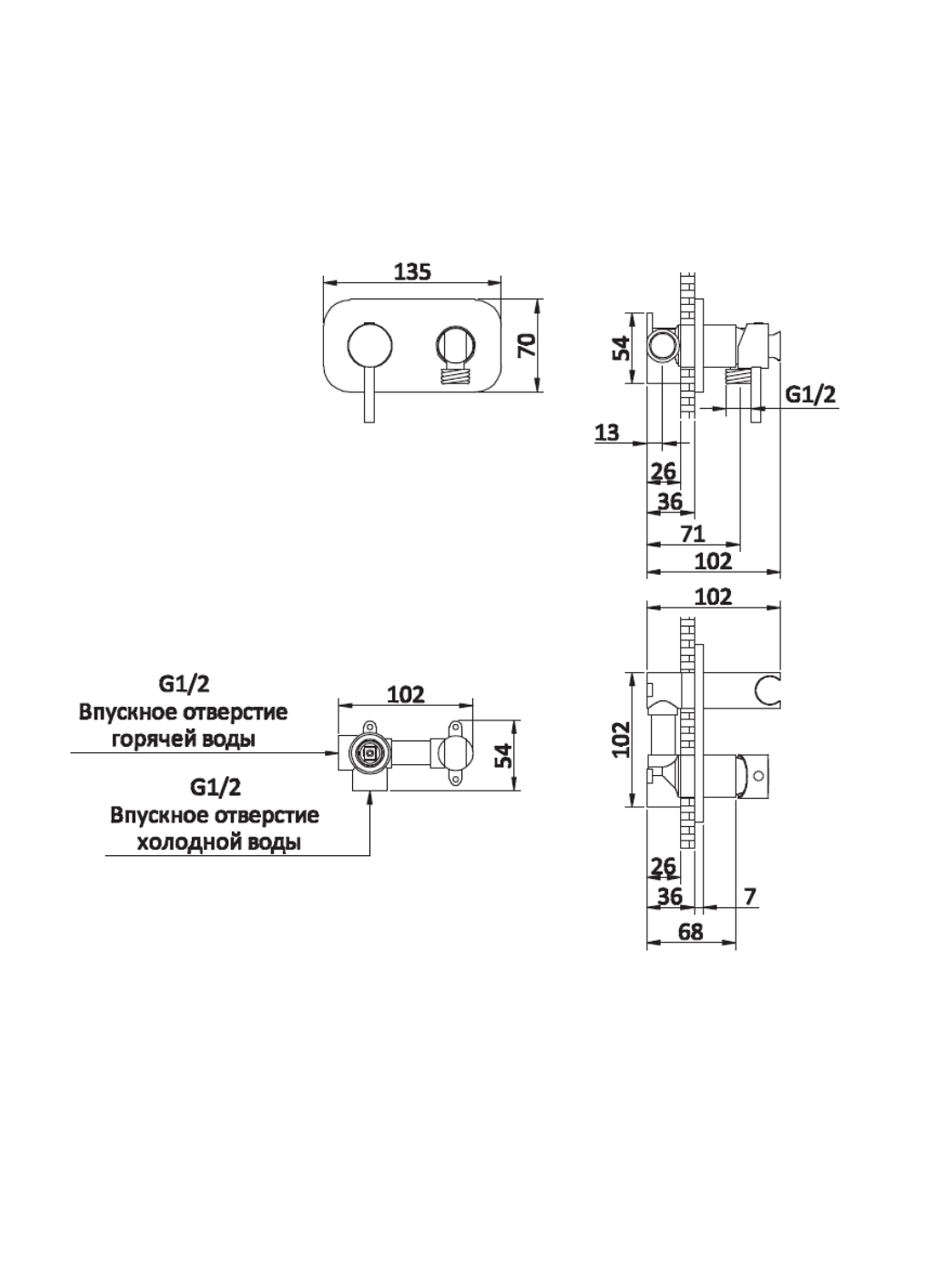 Комплектация: встраиваемая часть, смеситель, штуцер/держатель, гигиеническая лейка, гибкий металлический шланг, декоративная панель
