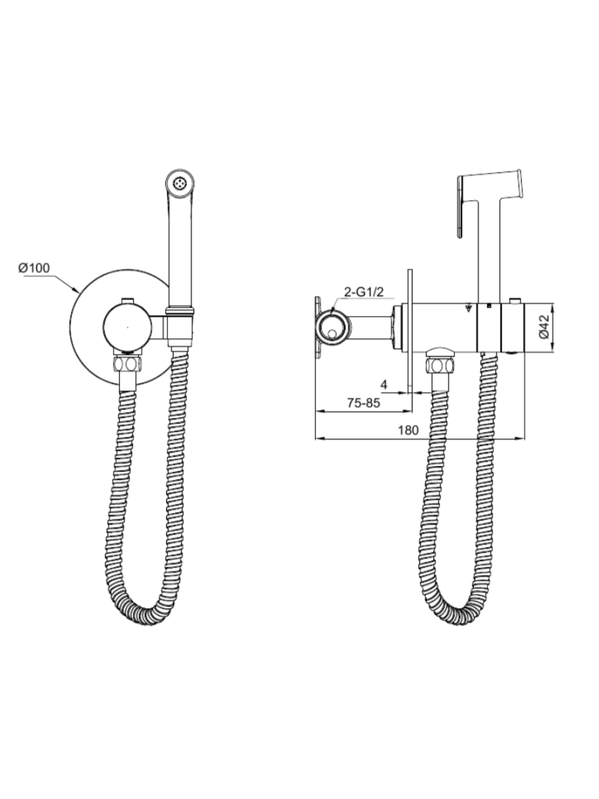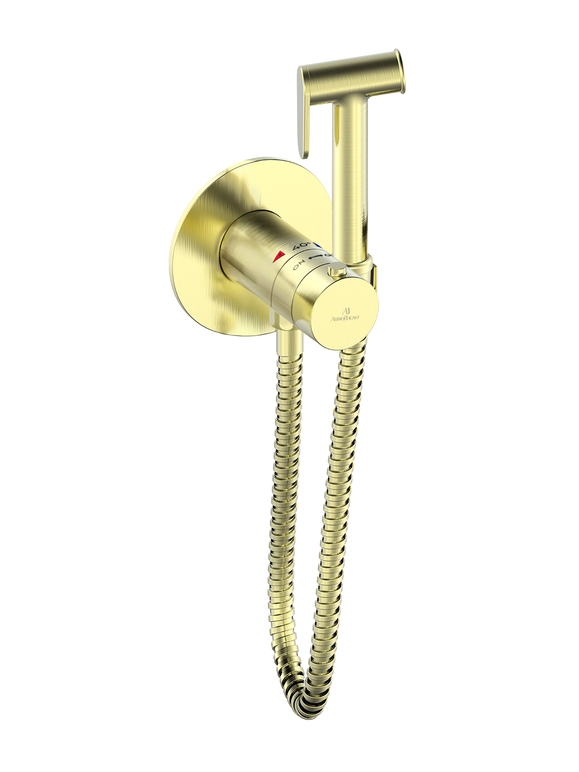 Комплектация: встраиваемая часть, термостатический смеситель, гигиеническая лейка, гибкий металлический шланг, декоративная панель