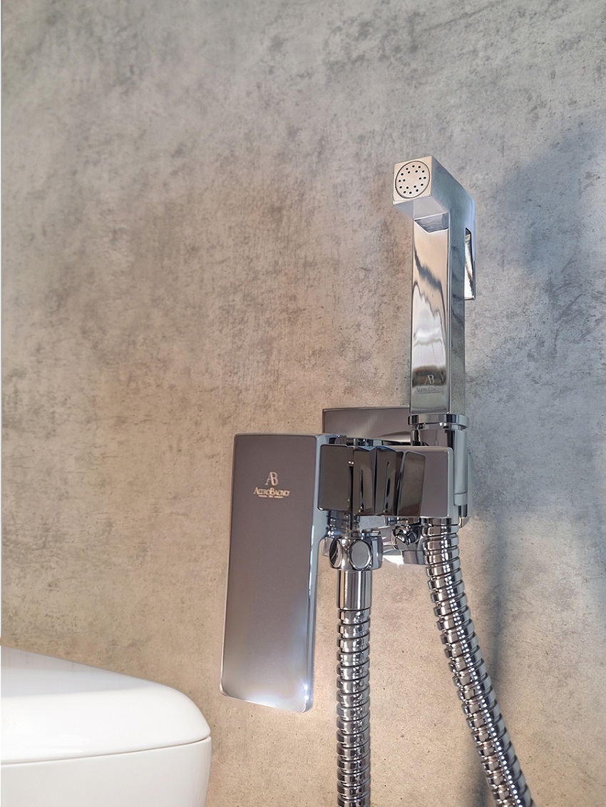 Комплектация: встраиваемая часть, смеситель, гигиеническая лейка, гибкий металлический шланг, декоративная панель