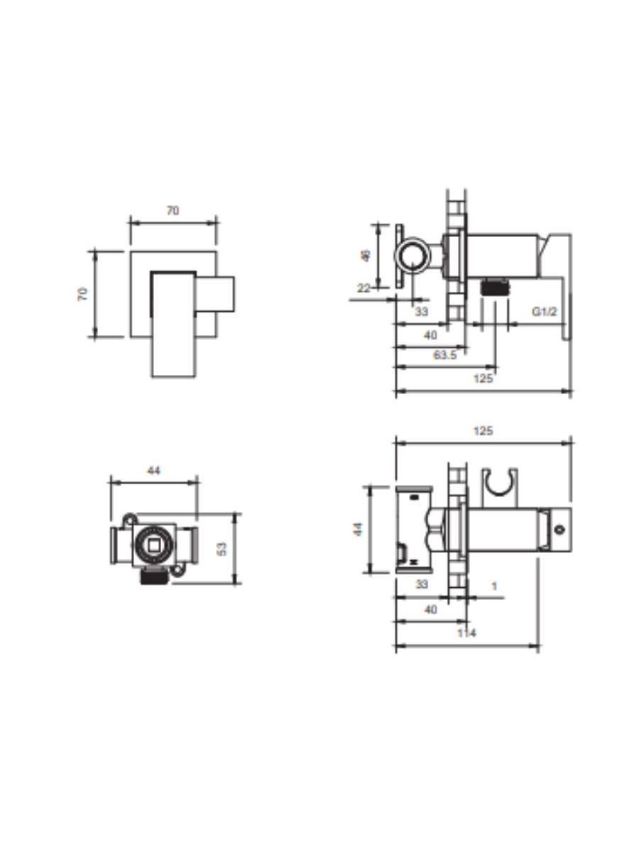 Комплектация: встраиваемая часть, смеситель, гигиеническая лейка, гибкий металлический шланг, декоративная панель
