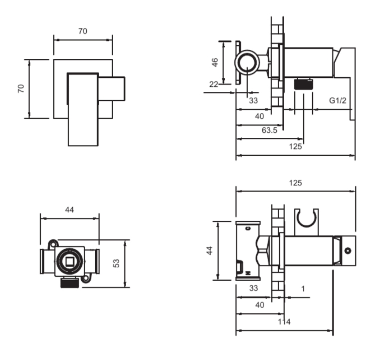 Комплектация: встраиваемая часть, смеситель, гигиеническая лейка, гибкий металлический шланг, декоративная панель