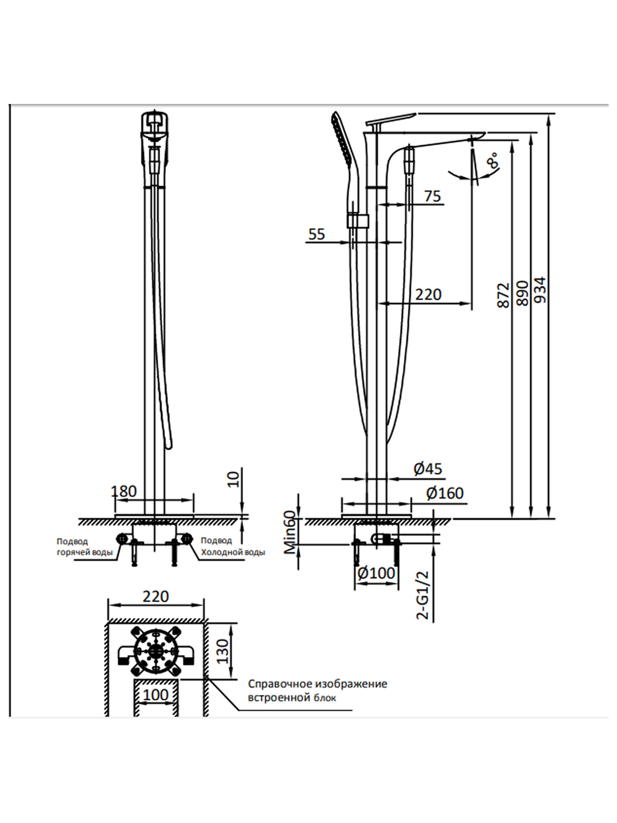 встраиваемая часть в пол, смеситель, аэратор, ручной душ, гибкий полимерный шланг, установочный комплект