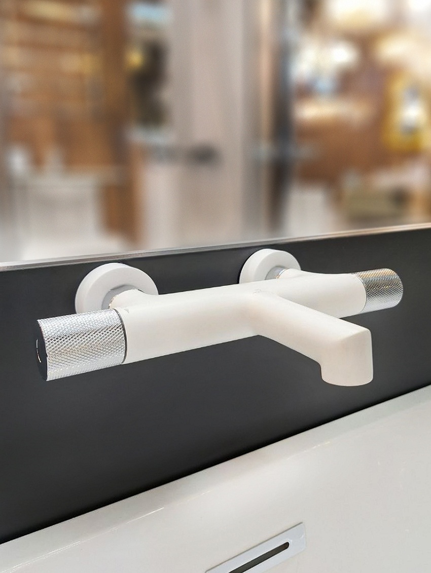 Комплектация: термостатический смеситель настенного монтажа, аэратор, эксцентрики, чаши декоративные