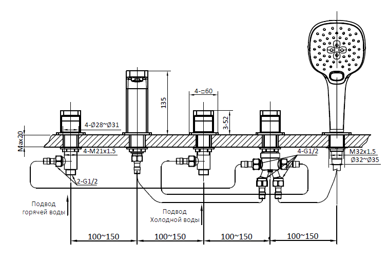 Комплектация: встраиваемая часть, смеситель, ручной душ, гибкий металлический шланг, аэратор, установочный комплект, подводки