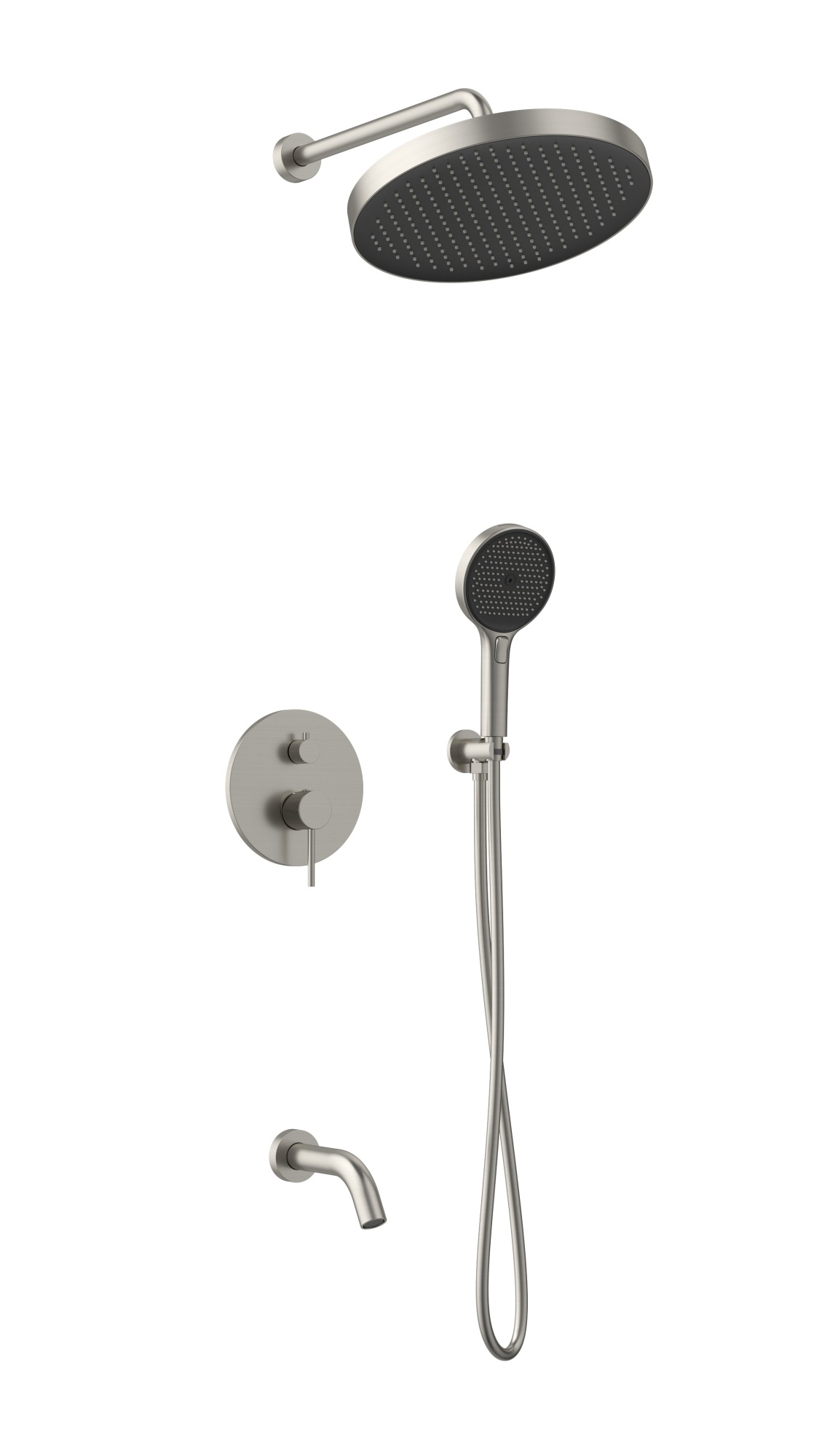 Комплектация: встраиваемая часть, смеситель с трехпозиционным переключением, излив, штуцер/держатель ручного душа, ручной душ, гибкий полимерный шланг, верхний душ, кронштейн держатель для верхнего душа, отражатели, установочный комплект.