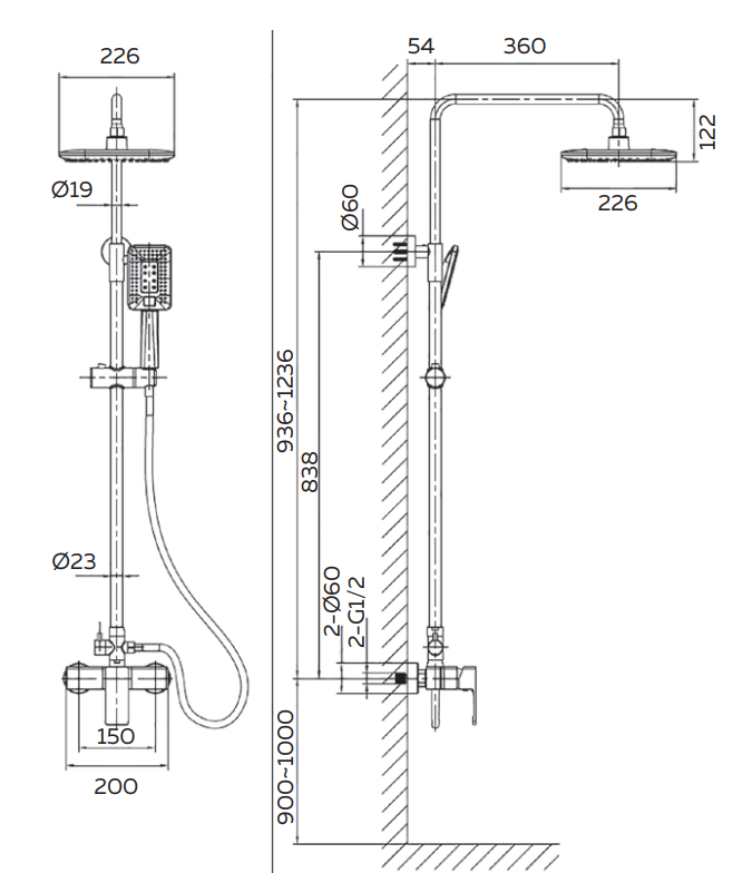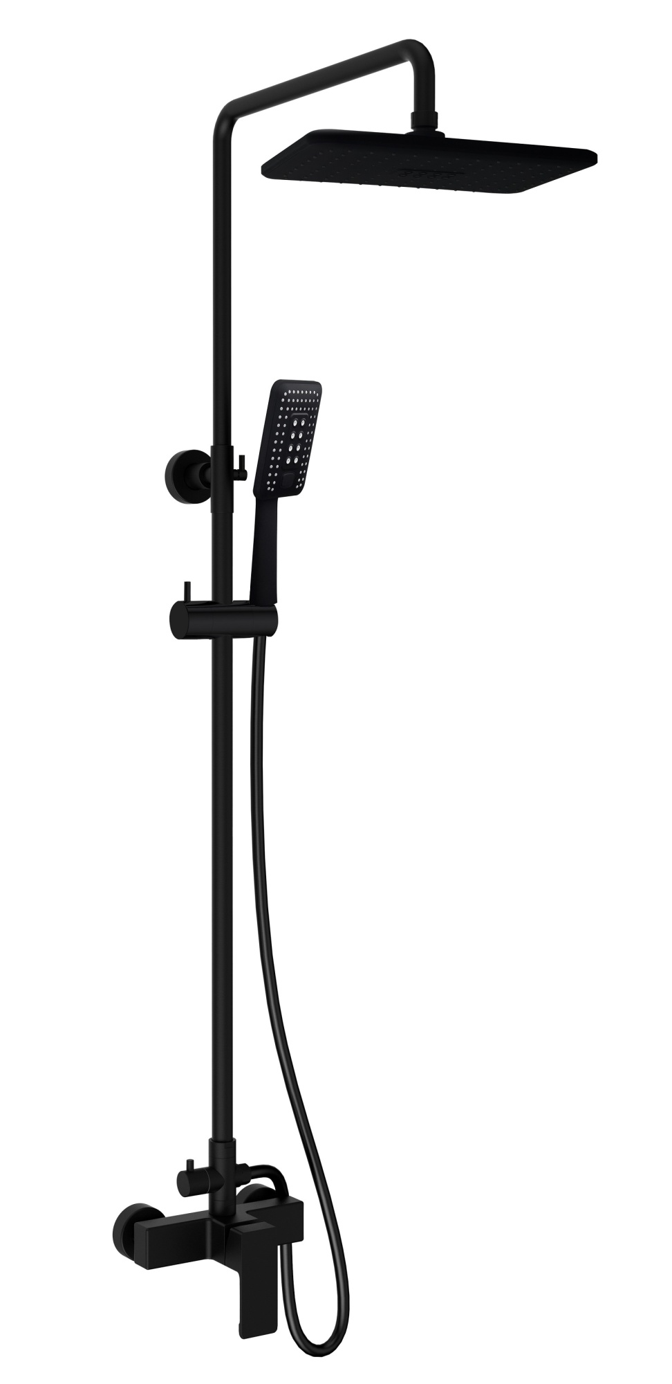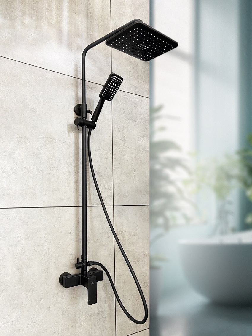 Комплектация: смеситель, телескопическая штанга с держателем для ручного душа, ручной душ, гибкий полимерный шланг, верхний душ, эксцентрики, декоративные чаши