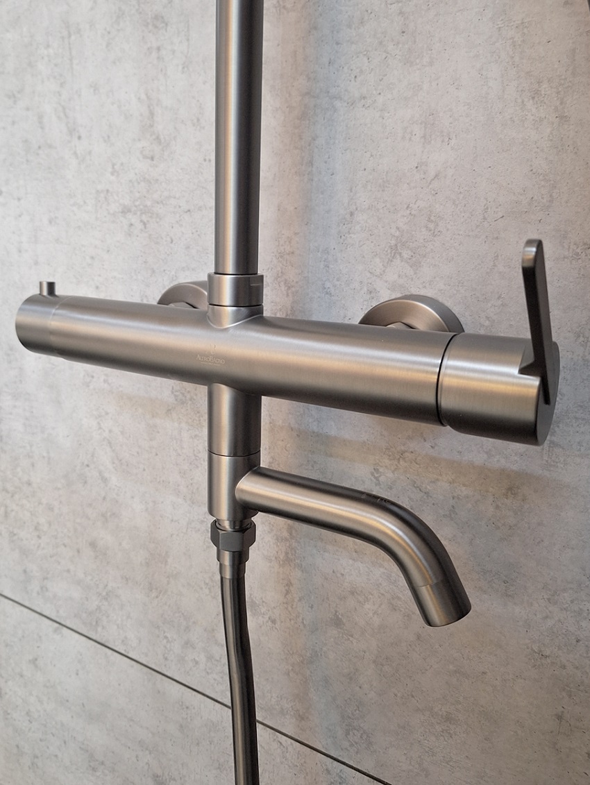Комплектация: смеситель настенного монтажа, телескопическая штанга с держателем для ручного душа, ручной душ, гибкий полимерный шланг, верхний душ, аэратор, эксцентрики, чаши декоративные