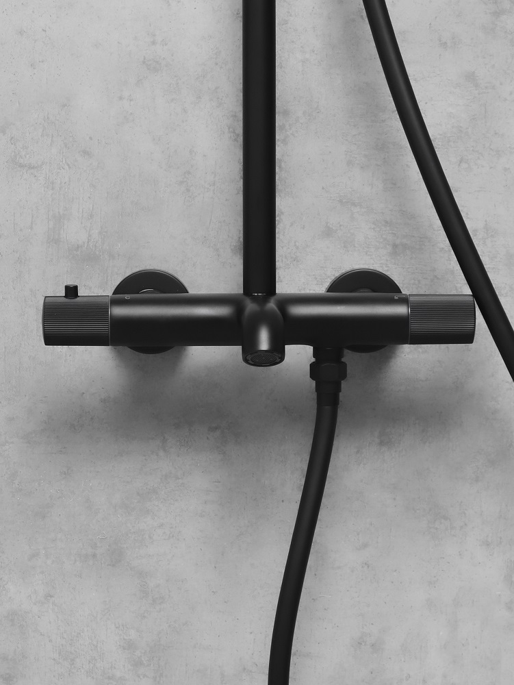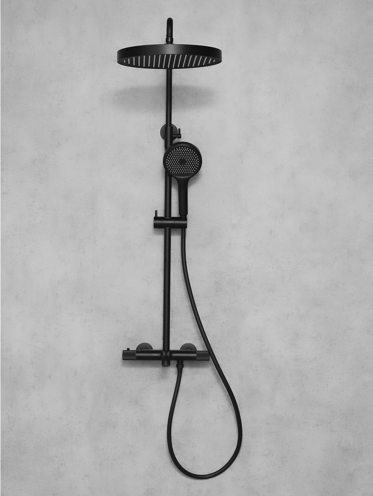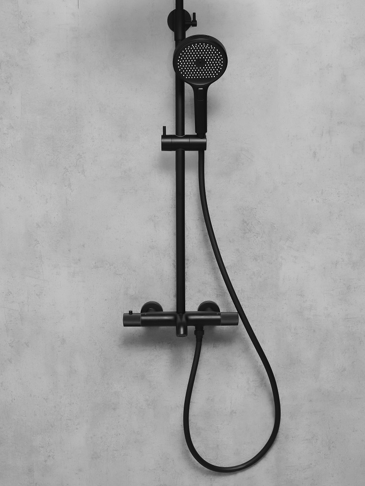 Комплектация: термостатический смеситель, телескопическая штанга с держателем для ручного душа, ручной душ, гибкий полимерный шланг, верхний душ, аэратор, эксцентрики, чаши декоративные, установочный комплект