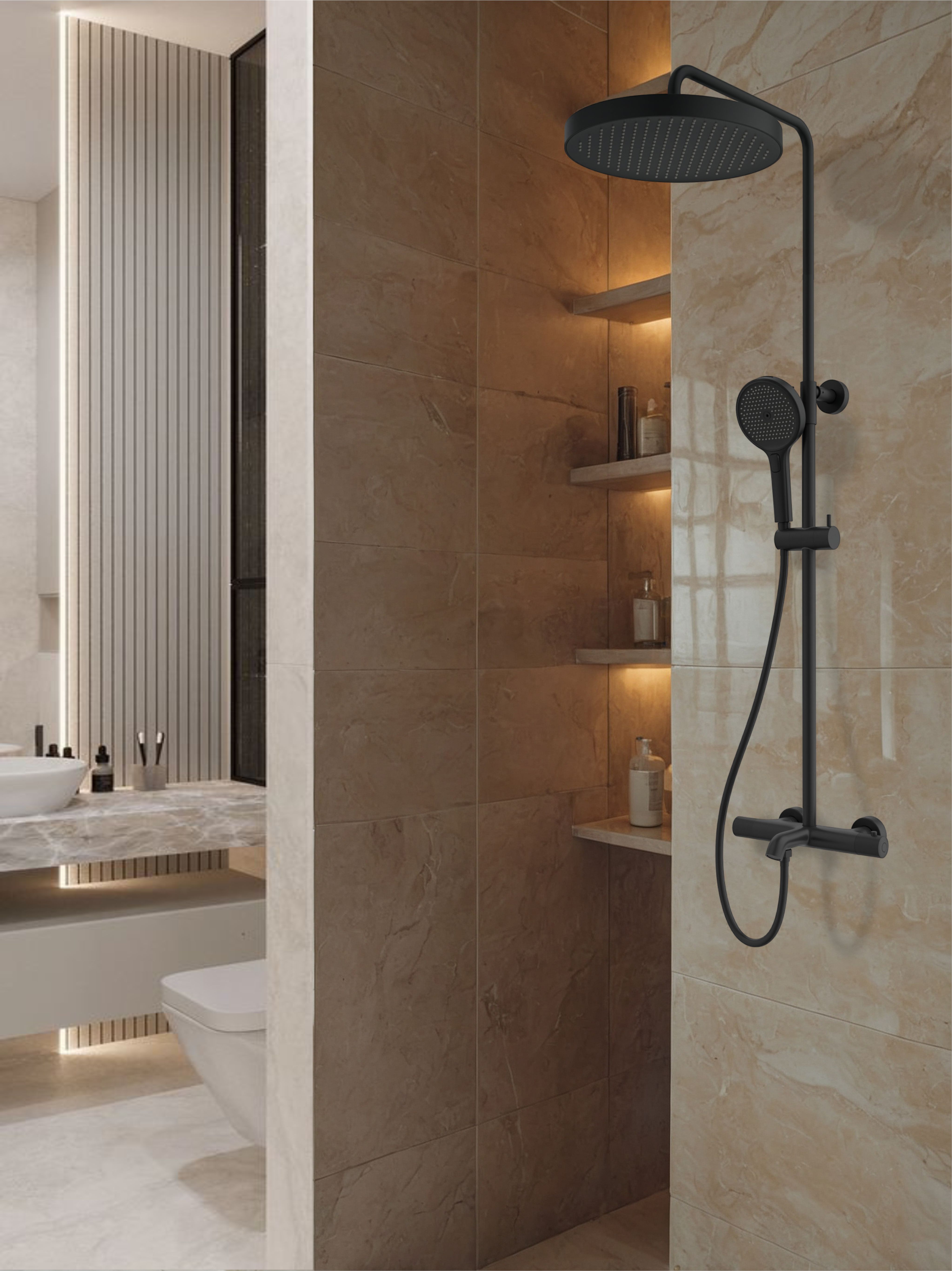термостатический смеситель, телескопическая штанга с держателем для ручного душа, ручной душ, гибкий полимерный шланг, верхний душ, аэратор, эксцентрики, чаши декоративные, установочный комплект