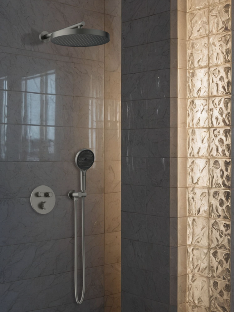 Дополнительные свойства: система ToccoFreddo - исключает возможность ожога о внешнюю поверхность смесителя, система Gioco верхнего душа +/-15º , пластиковый верхний душ 32 см, гибкий полимерный шланг с защитой от заломов, двухрежимный пластиковый ручной душ с переключателями с внутренней и внешней стороны, встраиваемая часть в установочном боксе оснащена уровнем, кнопочное переключение на режим верхней и ручной лейки