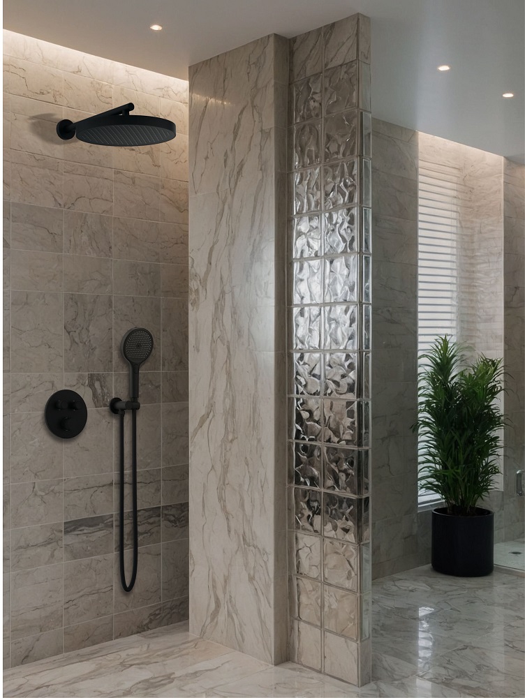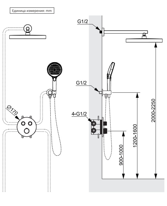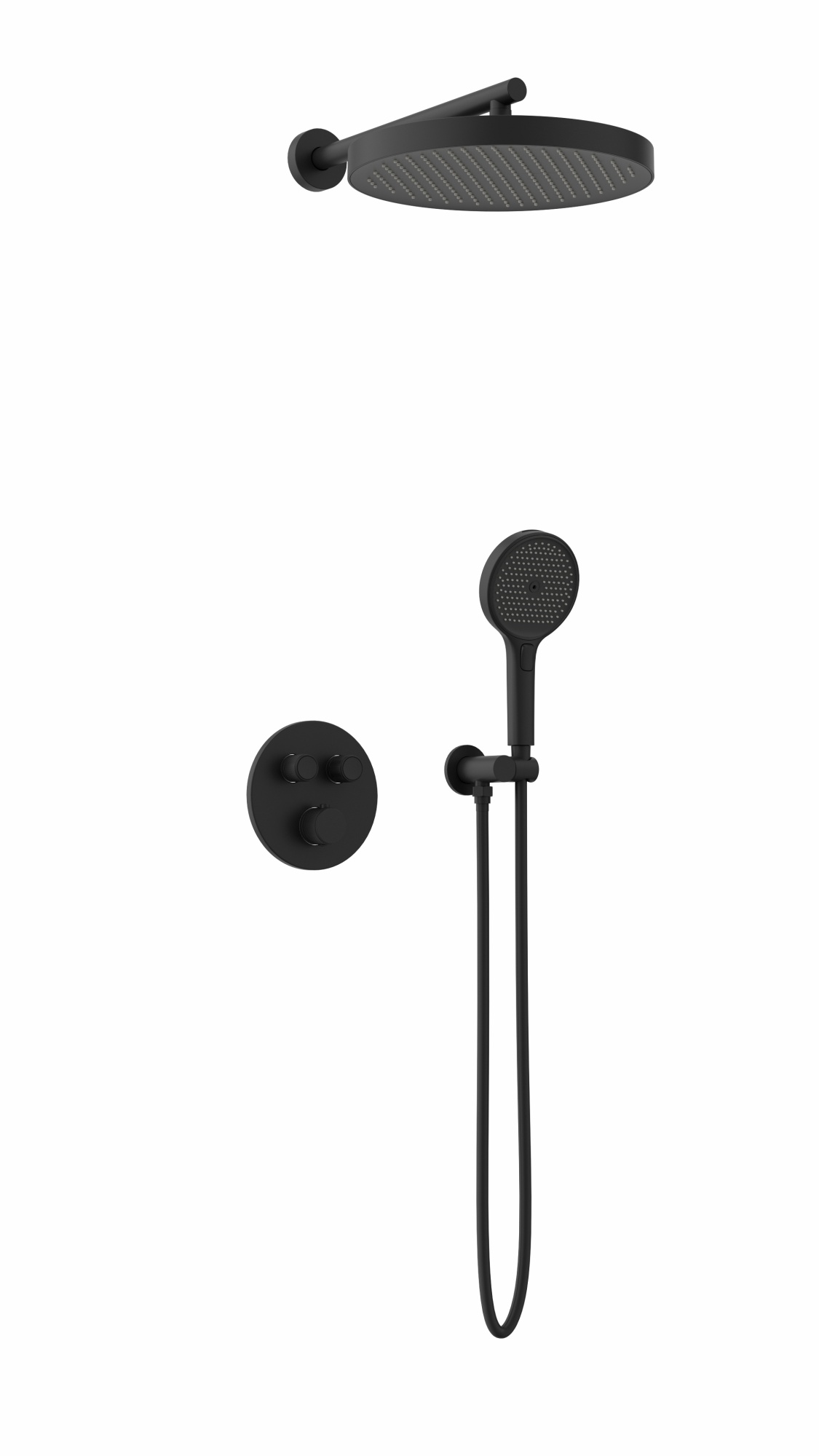 Комплектация: встраиваемая часть, термостатический смеситель, штуцер/держатель ручного душа, ручной душ, гибкий полимерный шланг, верхний душ, кронштейн излив для верхнего душа, отражатели, установочный комплект