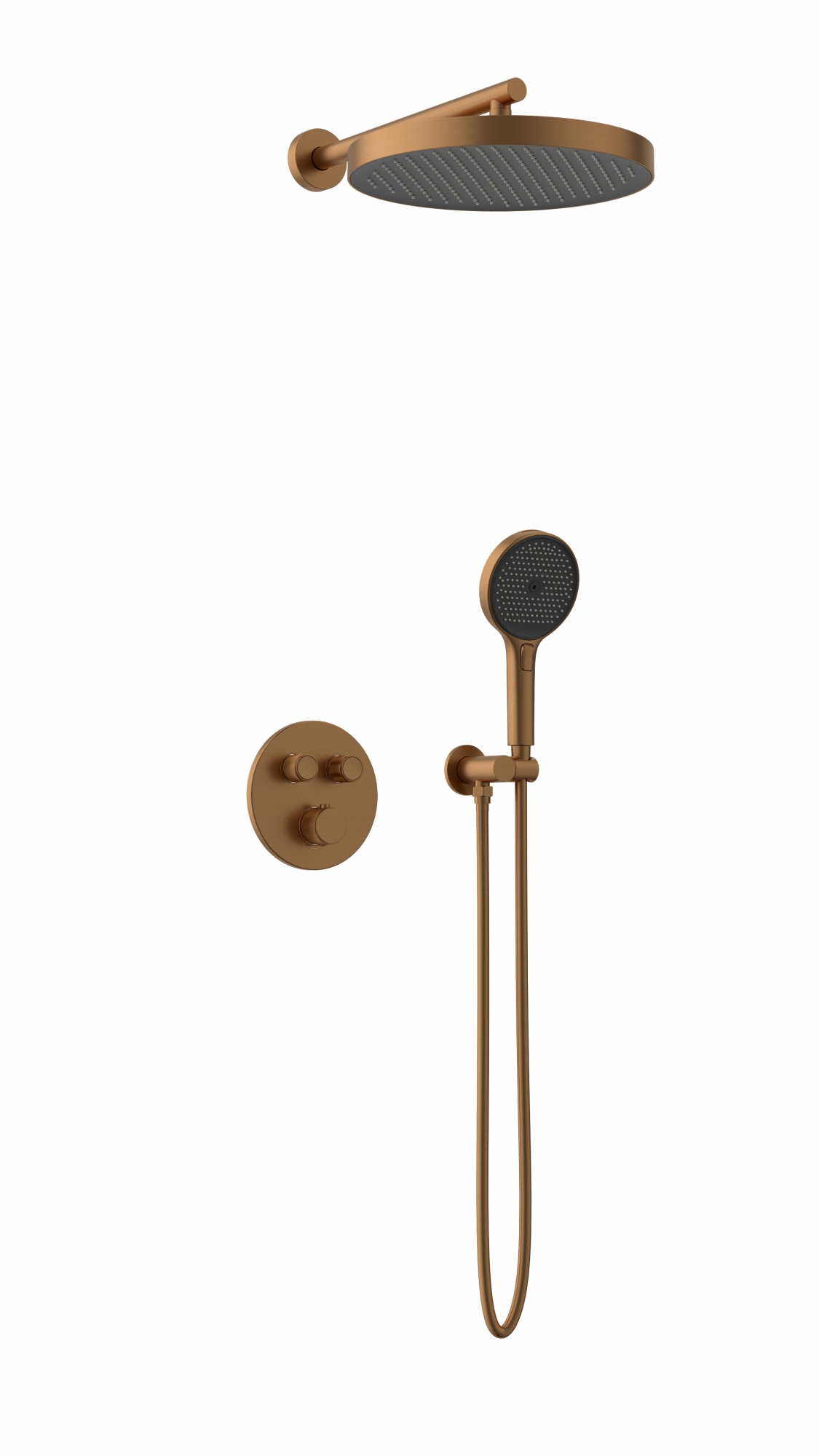 PVD - покрытие, система ToccoFreddo - исключает возможность ожога о внешнюю поверхность смесителя, система Gioco верхнего душа +/-15º , пластиковый верхний душ 32 см, гибкий полимерный шланг с защитой от заломов, двухрежимный пластиковый ручной душ с переключателями с внутренней и внешней стороны, встраиваемая часть в установочном боксе оснащена уровнем, кнопочное переключение на режим верхней и ручной лейки