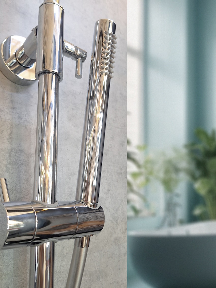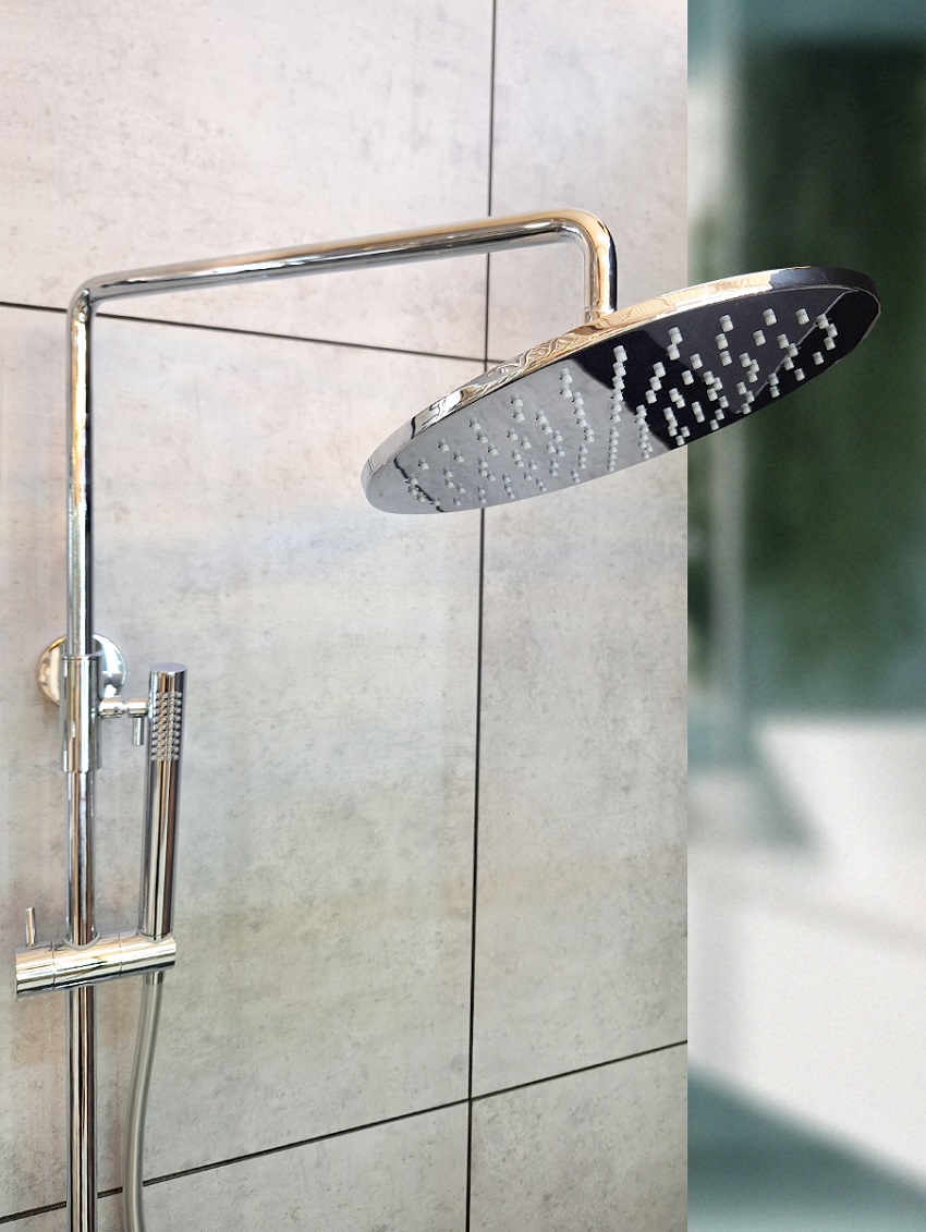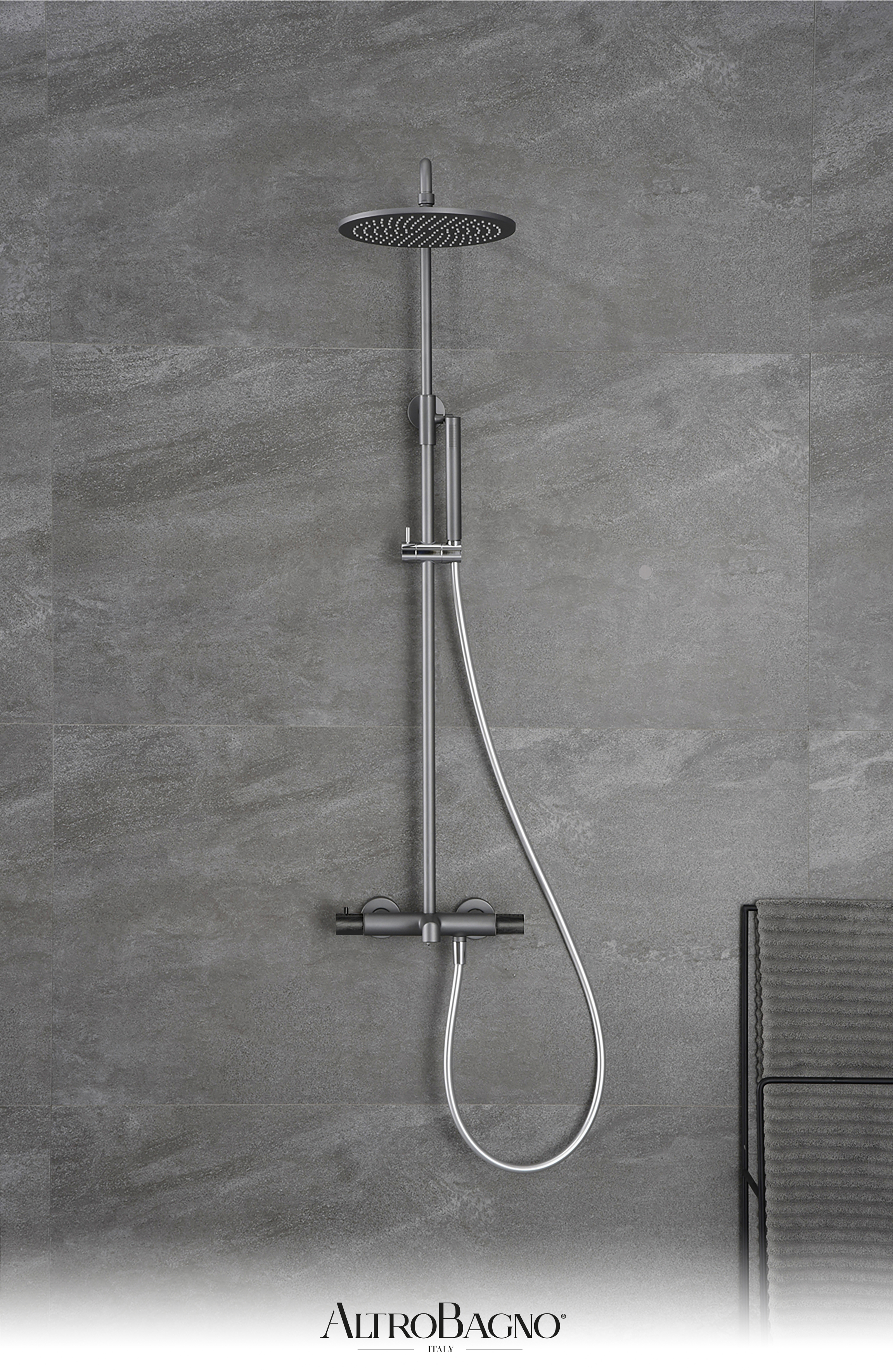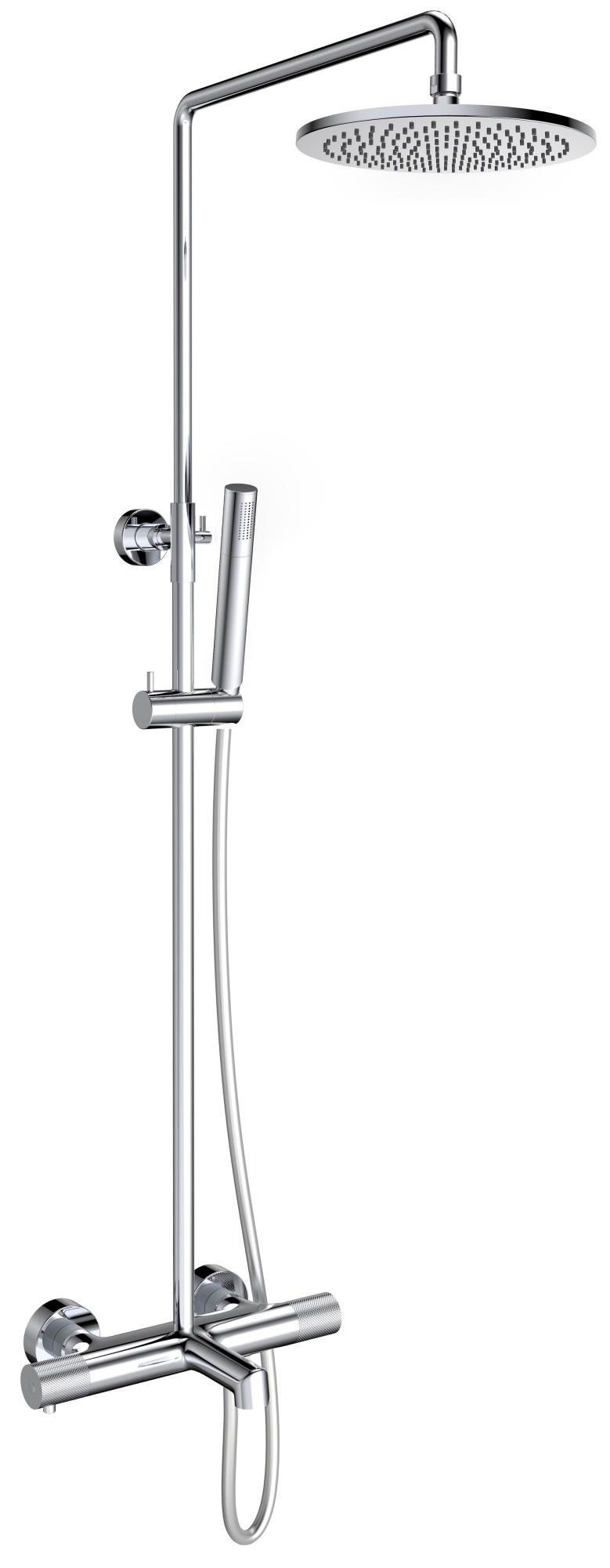 Комплектация: термостатический смеситель, телескопическая штанга с держателем для ручного душа, латунный ручной душ, гибкий полимерный шланг, латунный верхний душ, аэратор, эксцентрики, чаши декоративные