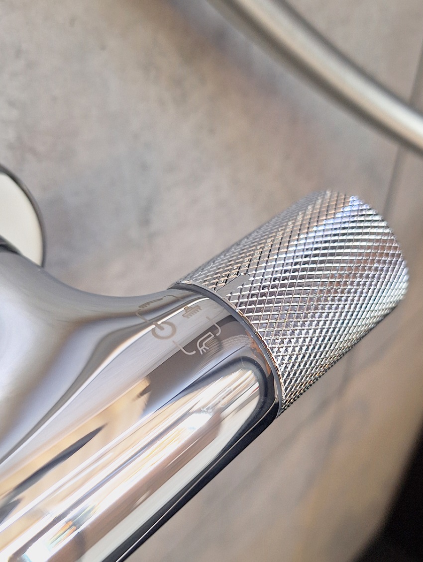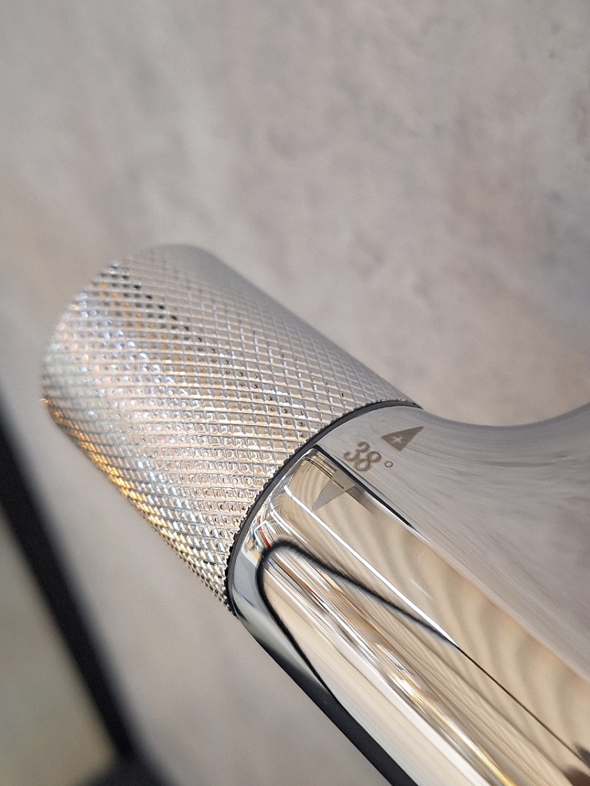 система ToccoFreddo - исключает возможность ожога о внешнюю поверхность смесителя, система Telescopico - дает возможность регулирования высоты душевой системы, система Gioco верхнего душа +/-15º, латунный верхний душ, гибкий полимерный шланг с защитой от заломов, латунный ручной душ, аэратор - смешивающий воду с воздухом и рассеивает ее, для более объемной и мягкой воды.