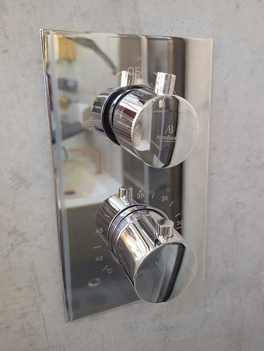 Дополнительные свойства: система ToccoFreddo - исключает возможность ожога о внешнюю поверхность смесителя, система Gioco верхнего душа +/-15º, латунный верхний душ