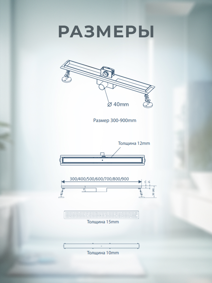 регулируемые опоры до 55 мм / выдерживает нагрузку до 300 кг / высокая пропускная способность / поворотный сифон 360° с регулировкой по высоте / съемный клапан сифона / двусторонняя решетка