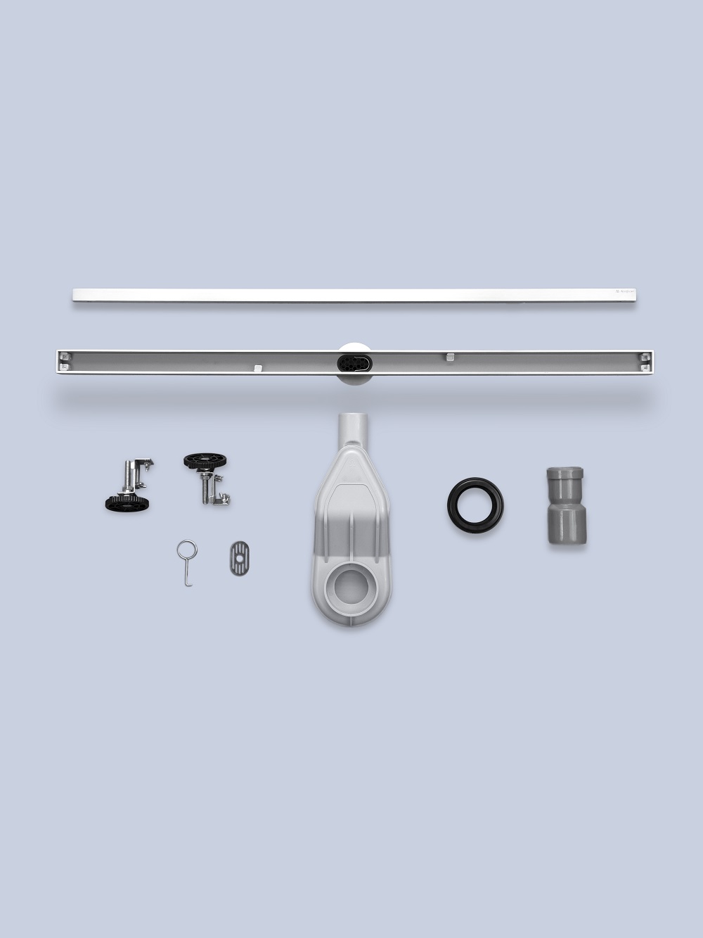 регулируемые опоры / выдерживает нагрузку до 300 кг / высокая пропускная способность / поворотный сифон 360° с регулировкой по высоте / съемный клапан сифона / решетка