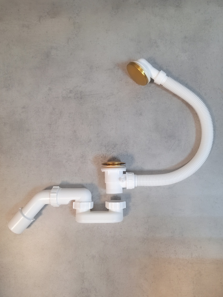 слив-перелив, декоративная накладка на слив, донный клапан с системой клик - клак , отвод для подключения слива-перелива, сифон, комплект резинок для установки.